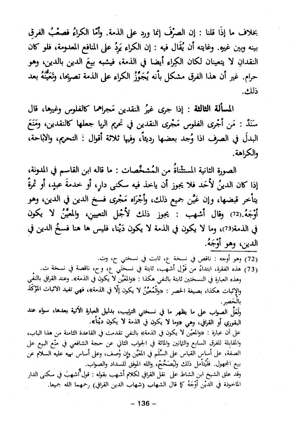 الصورة الثانية المستثْناةُ من المُشخَّصات: ما قاله ابن القاسم في المدونة، إذا كان الدينُ لأحَد فلا يجوز أن ياخذ فيه سكنى دارٍ، أو خدمةَ عبدٍ، أو ثمرةً يتأخر قبضها، وإن عَيَّن جميع ذلك، وأجْرَاه مَجْرى فسخ الدين في الدين، وهو أوْجَهُ. (٧٢) وقال أشهب: يجوز ذلك لأجْل التعيينِ، والمعيَّنُ لا يكون في الذمة (٧٣)، وما لا يكون في الذمة لا يكون دَيْنا، فليس ها هنا فسخُ الدين فيِ الدين، وهو أوْجَهُ.