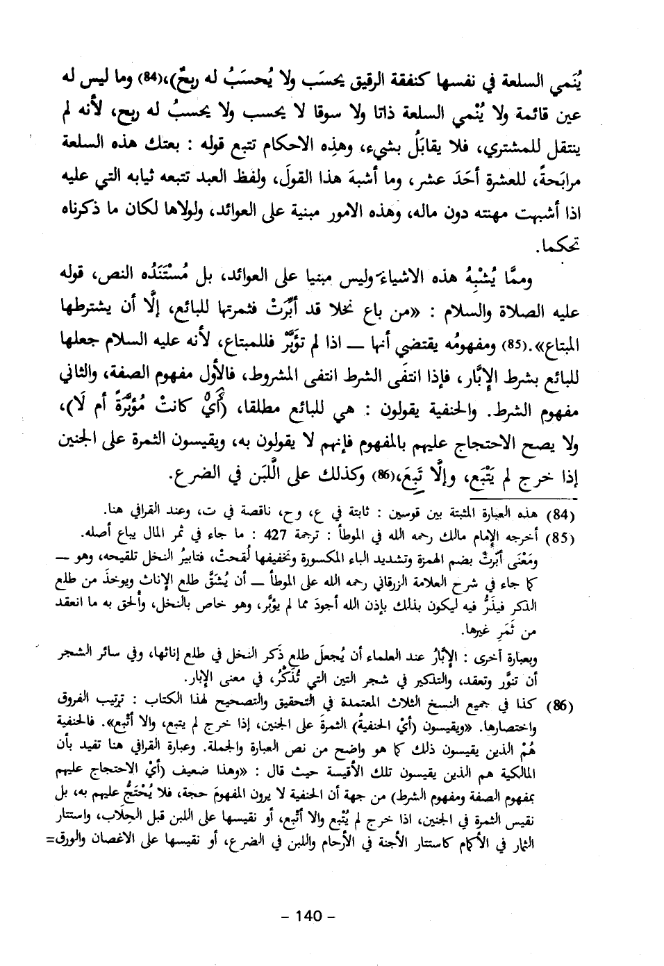 (٨٦) كذا في جميع النسخ الثلاث المعتمدة في التحقيق والتصحيح لهذا الكتاب: ترتيب الفروق واختصارها. "ويقيسون (أيْ الحنفيةُ) - الثمرةَ على الجنين، إذا خرج لم يتبع، والا أتْبع". فالحنفية هُمْ الذين يقيسون ذلك كما هو واضح من نص العبارة والجملة. وعبارة القرافي هنا تفيد بأن المالكية هم الذين يقيسون تلك الأقيسة حيث قال: "وهذا ضعيف (أيْ الاحتجاج عليهم بمفهوم الصفة ومفهوم الشرط) من جهة أن الحنفية لا يرون المفهومَ حجة، فلا يُحْتَجُّ علهم به، بل نقيس الثمرة في الجنين، إذا خرج لم يُتْبع والا أتْبع، أو نقيسها على اللبن قبل الحِلَاب، واستتار الثمار في الأكمام كاستتار الأجنة في الأرحام واللبن في الضرع، أو نقيسها على الاغصان والورق =