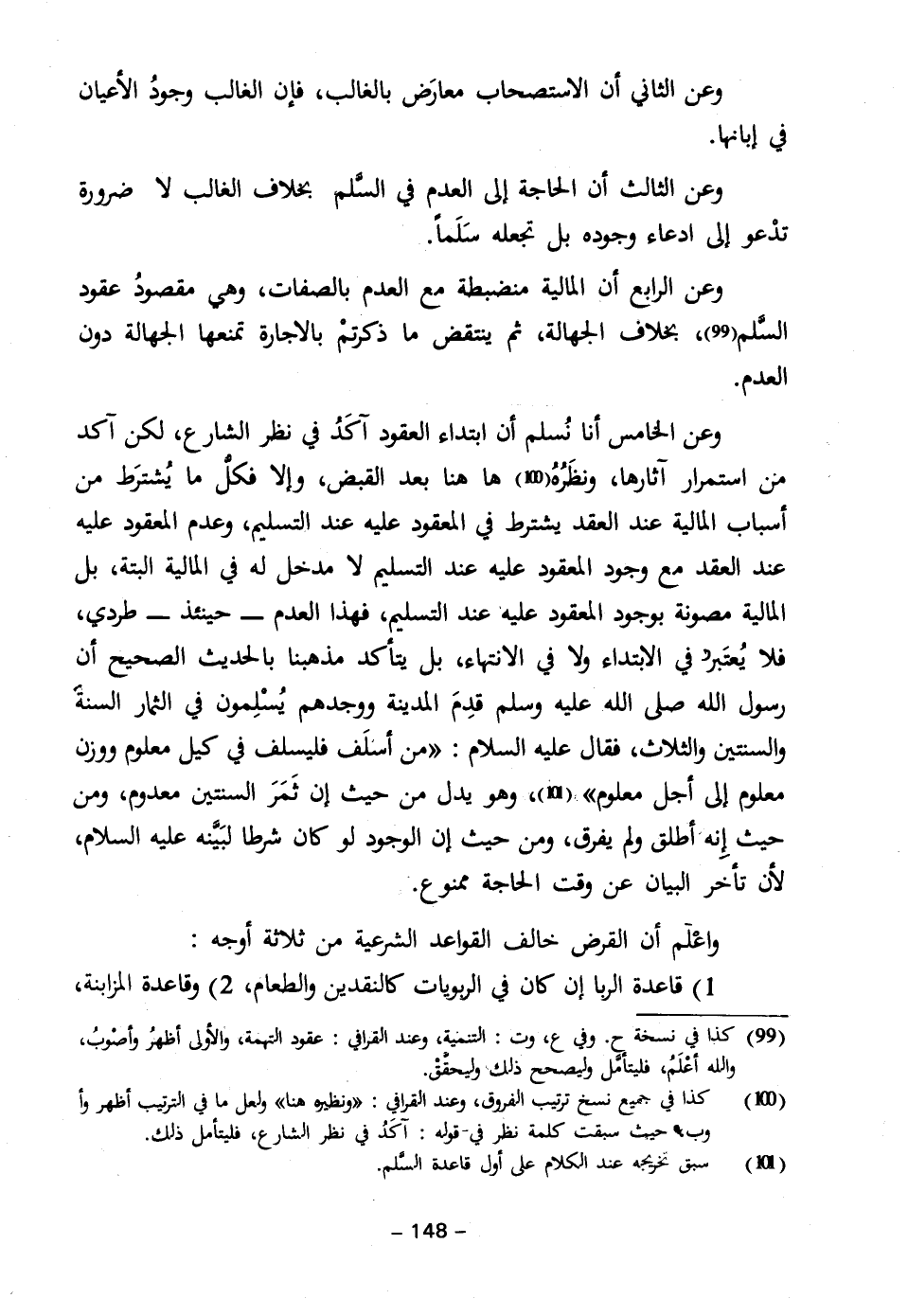 وعن الخامس أنا نُسلم أن ابتداء العقود آكَدُ في نظر الشارع، لكن آكد من استمرار آثارها، ونظَرُهُ (١٠٠) ها هنا بعد القبض، وإلا فكلُّ ما يُشترَط من أسباب المالية عند العقد يشترط في المعقود عليه عند التسليم، وعدم المعقود عليه عند العقد مع وجود المعقود عليه عند التسليم لا مدخل له في المالية البتة، بل المالية مصونة بوجود المعقود عليه عند التسليم، فهذا العدم - حينئذ - طردي، فلا يُعتَبر في الابتداء ولا في الانتهاء، بل يتأكد مذهبنا بالحديث الصحيح أن رسول الله - صلى الله عليه وسلم - قدِمَ المدينة ووجدهم يُسْلِمون في الثمار السنةَ والسنتين والثلاث، فقال عليه السلام: "من أسلَف فليسلف في كيل معلوم ووزن معلوم إلى أجل معلوم" (١٠١)، وهو يدل من حيث إن ثَمَرَ السنتين معدوم، ومن حيث إِنهَ أطلق ولم يفرق، ومن حيث إن الوجود لو كان شرطا لبَيَّنه عليه السلام، لأن تأخر البيان عن وقت الحاجة ممنوع.