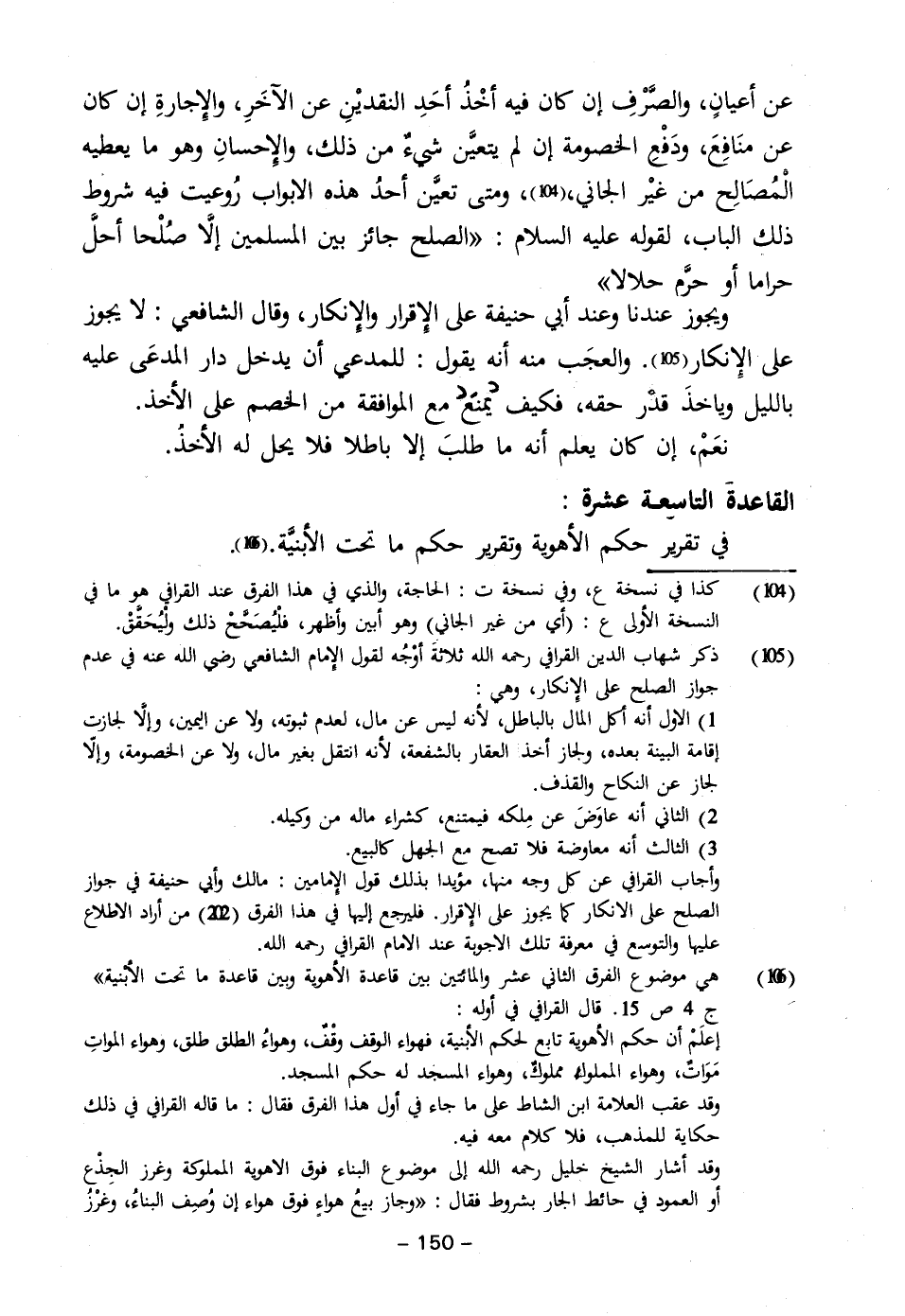 (١٠٥) ذكر شهاب الدين القرافي رحمه الله ثلاثةَ أوْجُه لقول الإِمام الشافعى رضي الله عنه في عدم جواز الصلح على الإِنكار، وهي: