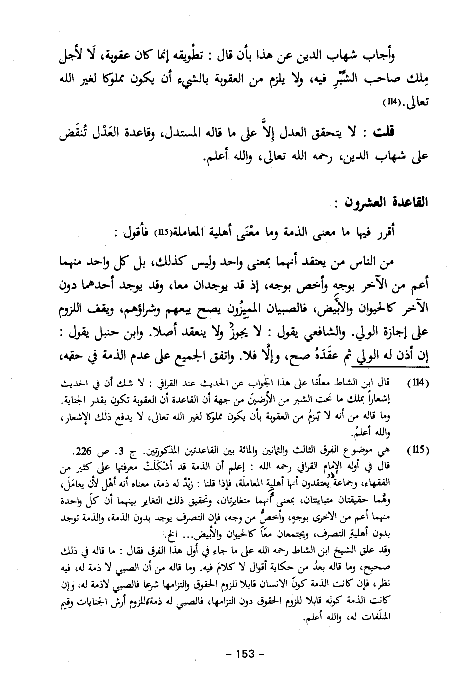 (١١٥) هي موضوع الفرق الثالث والثمانين والمائة بين القاعدتين المذكورتين. جـ ٣. ص ٢٢٦. قال في أوله الإِمام القرافي رحمه الله: إعلم أن الذمة قد أشكَلَتْ معرفتها على كثير من الفقهاء، وجماعة يُعتقدون أنها أهلية المعاملَة، فإذا قلنا: زيْدٌ له ذمة، معناه أنه أهْل لأن يعامَلَ، وهُما حقيقتان متباينتان، بمعنى أنهما متغايرتان، وتحقيق ذلك التغاير بينهما أن كلّ واحدة منهما أعم من الاخرى بوجهٍ، وأخصُّ من وجه، فإن التصرف يوجد بدون الذمة، والذمة توجد بدون أهليةِ التصرف، ويجتمعان معًا كالحيوان والأبيض ... الخ
