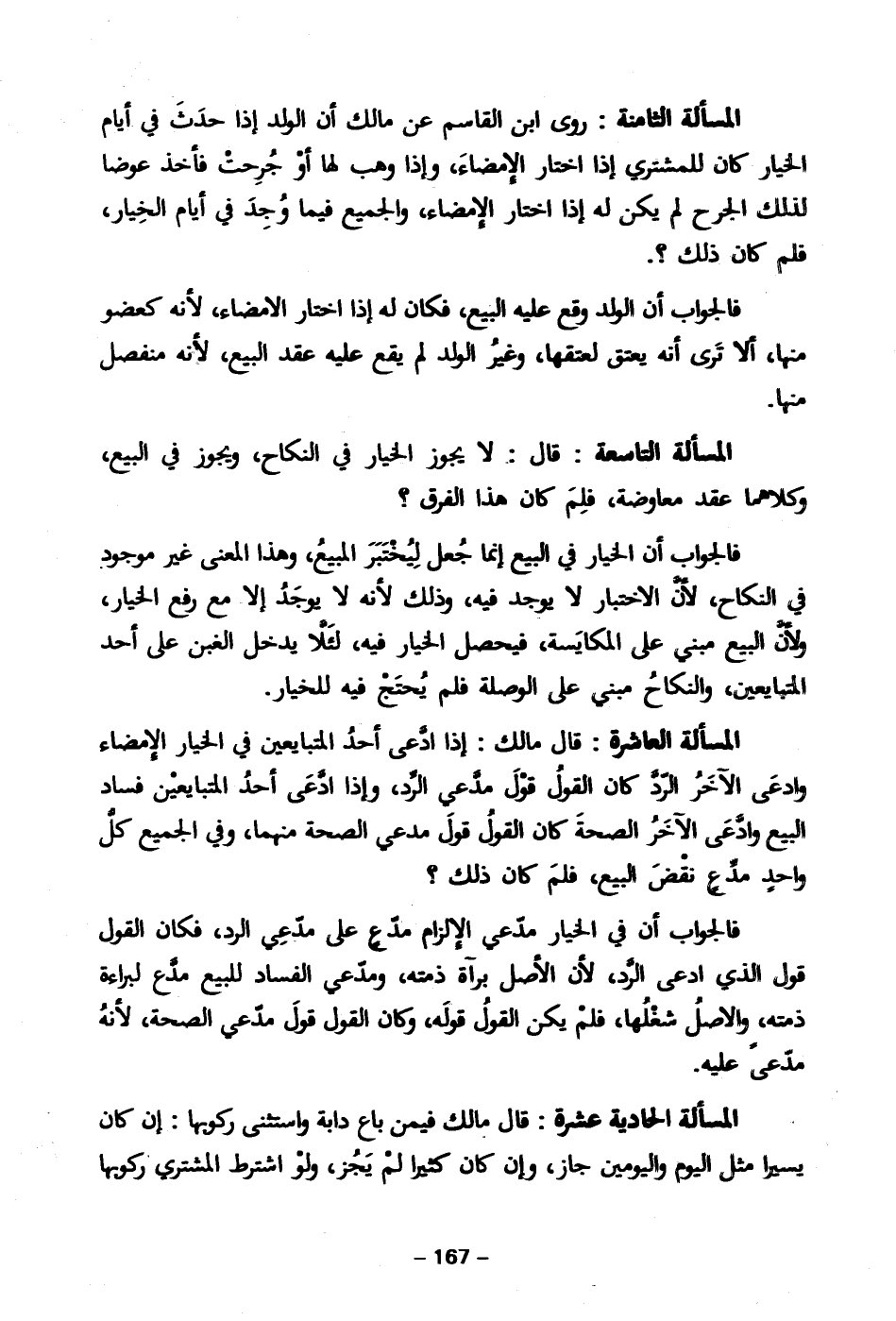 المسأله الثامنة: روى ابن القاسم عن مالك أن الولد أذا حدَثَ في أيام الخيار كان للمشتري إذا اختار الإمضاء وأذا وهب لها أوْ جُرِحتْ فأخذ عوضا لذلك الجرح لم يكن له إذا اختار الإمضاء، والجميع فيما وُجِدَ في أيام الخِيار، فلم كان ذلك؟ .