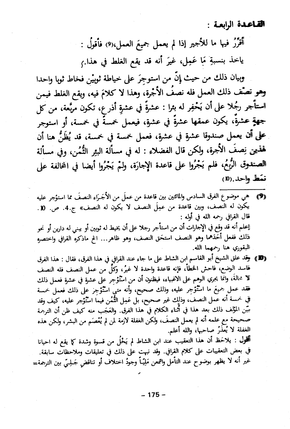(٩) هي موضوع الفرق السادس والمائتين بين قاعدة من عملَ من الأجَرَاء النصفَ مما استؤجر عليه يكون له النصف، وبين قاعدة من عمِلَ النصف لا يكون له النصف" جـ ٤. ص. ١٠.