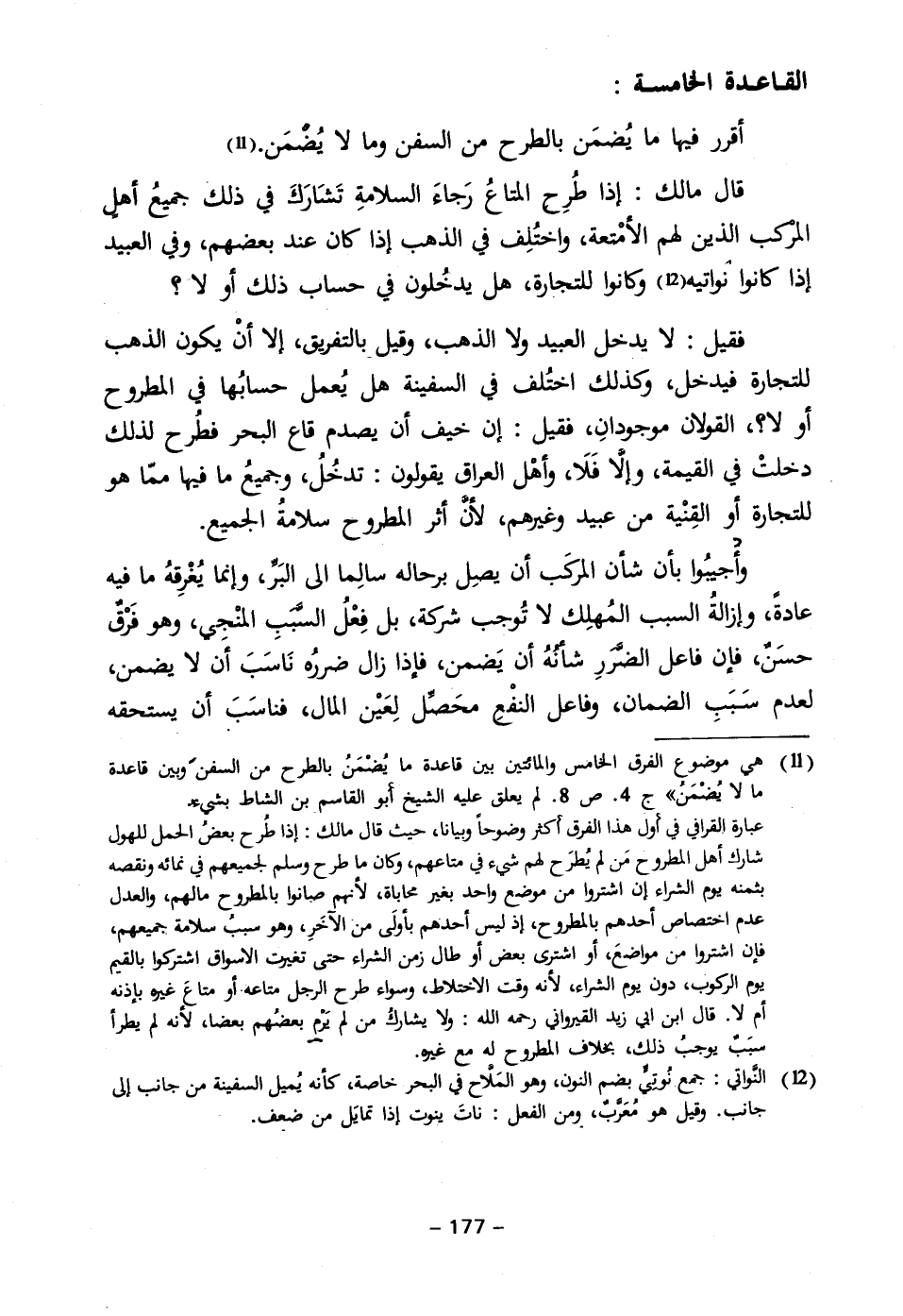 (١١) هي موضوع الفرق الخامس والمائتين بين قاعدة ما يُضْمَنُ بالطرح من السفنَ وبين قاعدة ما لا يضْمَنُ" جـ ٤. ص ٨. لم يعلق عليه الشيخ أبو القاسم بن الشاط بشيء