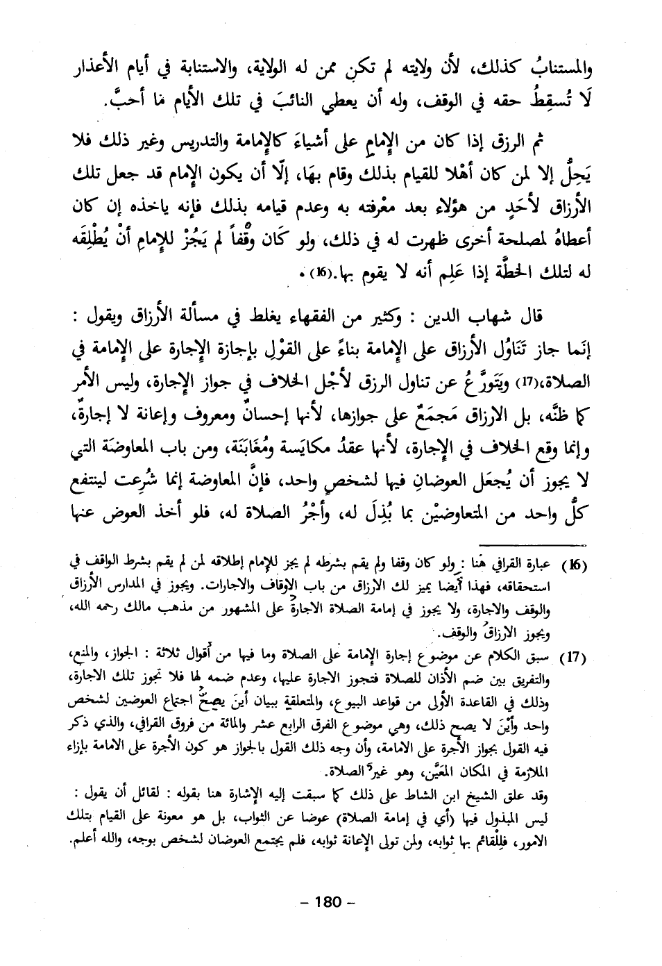 (١٦) عبارة القرافي هنا: وِلو كان وقفا ولم يقم بشرطه لم يجز لإمام إطلاقه لمن لم يقم بشرط الواقف في استحقاقه، فهذا أيضا يميز لك الارزاق من باب الاوقاف والاجارات. ويجوز في المدارس الأرزاق والوقف والاجارة، ولا يجوز في إمامة الصلاة الاجارة على المشهور من مذهب مالك رحمه الله، ويجوز الارزاق والوقف.