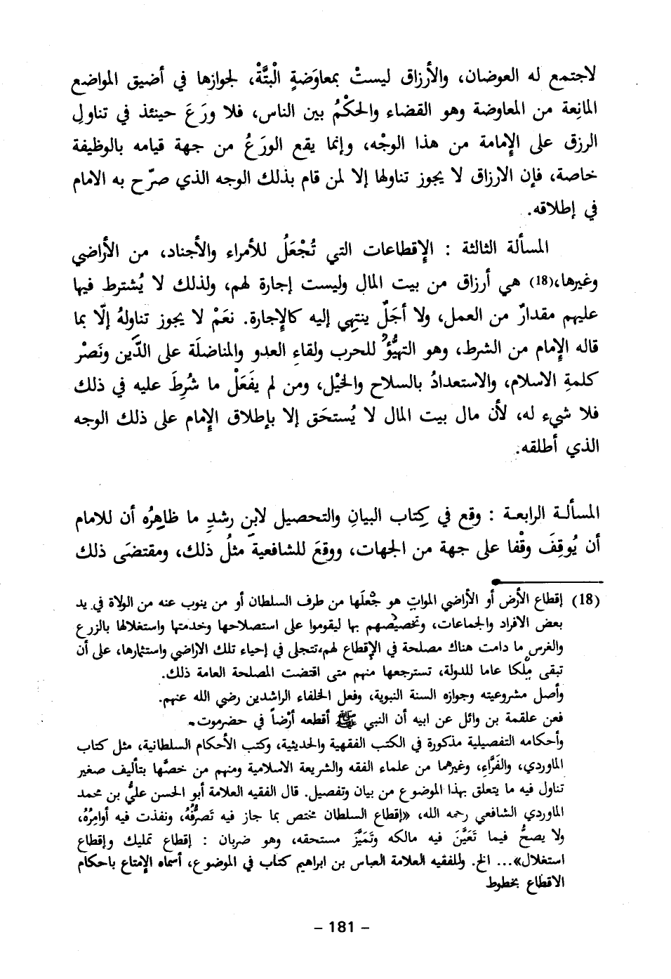 المسألة الثالثة: الإقطاعات التي تُجْعَلُ للأمراء والأجناد، من الأراضي وغيرها، (١٨) هي أرزاق من بيت المال وليست إجارة لهم، ولذلك لا يُشترط فيها عليهم مقدارٌ من العمل، ولا أجَل ينتهِي اليه كالإِجارة. نعَمْ لا يجوز تناولهُ إلّا بما قاله الإِمام من الشرط، وهو التهيُّؤ للحرب ولقاءِ العدو والمناضلَة على الدّين ونَصْر كلمةِ الإسلام، والاستعدادُ بالسلاح والخيْل، ومن لم يفَعَلْ ما شُرِطَ عليه في ذلك فلا شيء له، لأن مال بيت المال لا يُستحَق إلا بإطلاق الإِمام على ذلك الوجه الذي أطلقه.