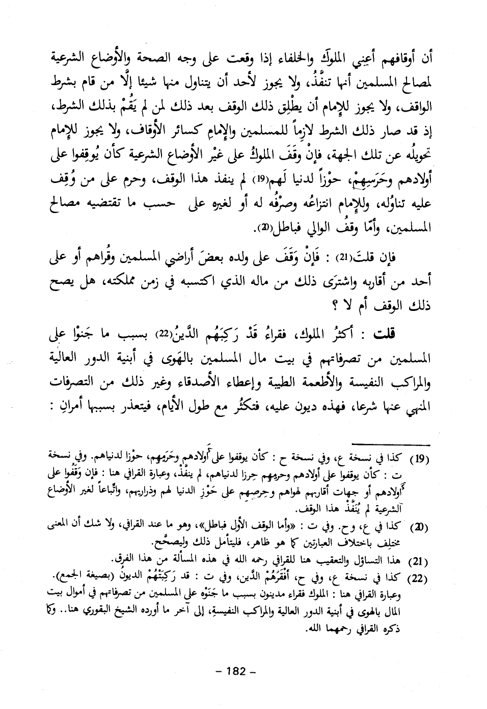 (١٩) كذا في نسخة ع، وفي نسخة ح: كأن يوقفوا على اولادهم وحَرَمهم، حوْزا لدنياهم. وفي نسخة ت: كأن يوقفوا على أولادهم وحرمَهم حِرزا لدنياهم، لم ينفذْ، وعبارة القرافي هنا: فإن وَقَفُوا على أولادهم أو جهات أقاربهم لهواهم وحِرصهِم على حَوْزِ الدنيا لهم وذراريهم، واتِّباعًا لغير الأوضاع الشرعية لم يُنَفذْ هذا الوقف.