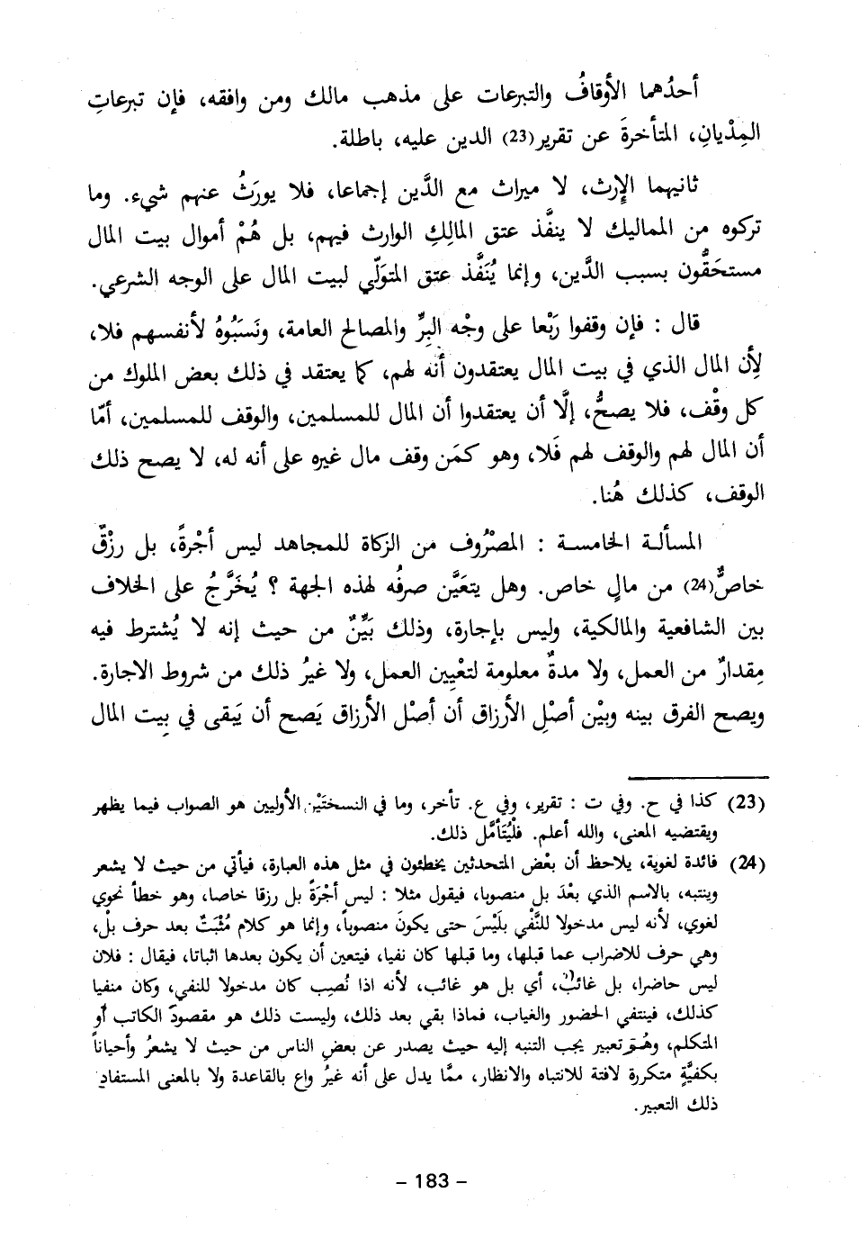 المسألة الخامسة: المصْرُوف من الزكاة للمجاهد ليس أجْرةً، بل رزْقٌ خاصٌّ (٢٤) من مالٍ خاص. وهل يتعَيَّن صرفُه لهذه الجهة؟ يُخَرَّجُ على الخلاف بين الشافعية والمالكية، وليس بإجارة، وذالك بَيِّنٌ من حيث انه لا يُشترط فيه مِقدارٌ من العمل، ولا مدةٌ معلومة لتعْيِين العمل، ولا غيرُ ذلك من شروط الاجارة. ويصح الفرق بينه وبيْن أصْلِ الأرزاق أن أصْل الأرزاق يَصح أن يَبقى في بِيت المال