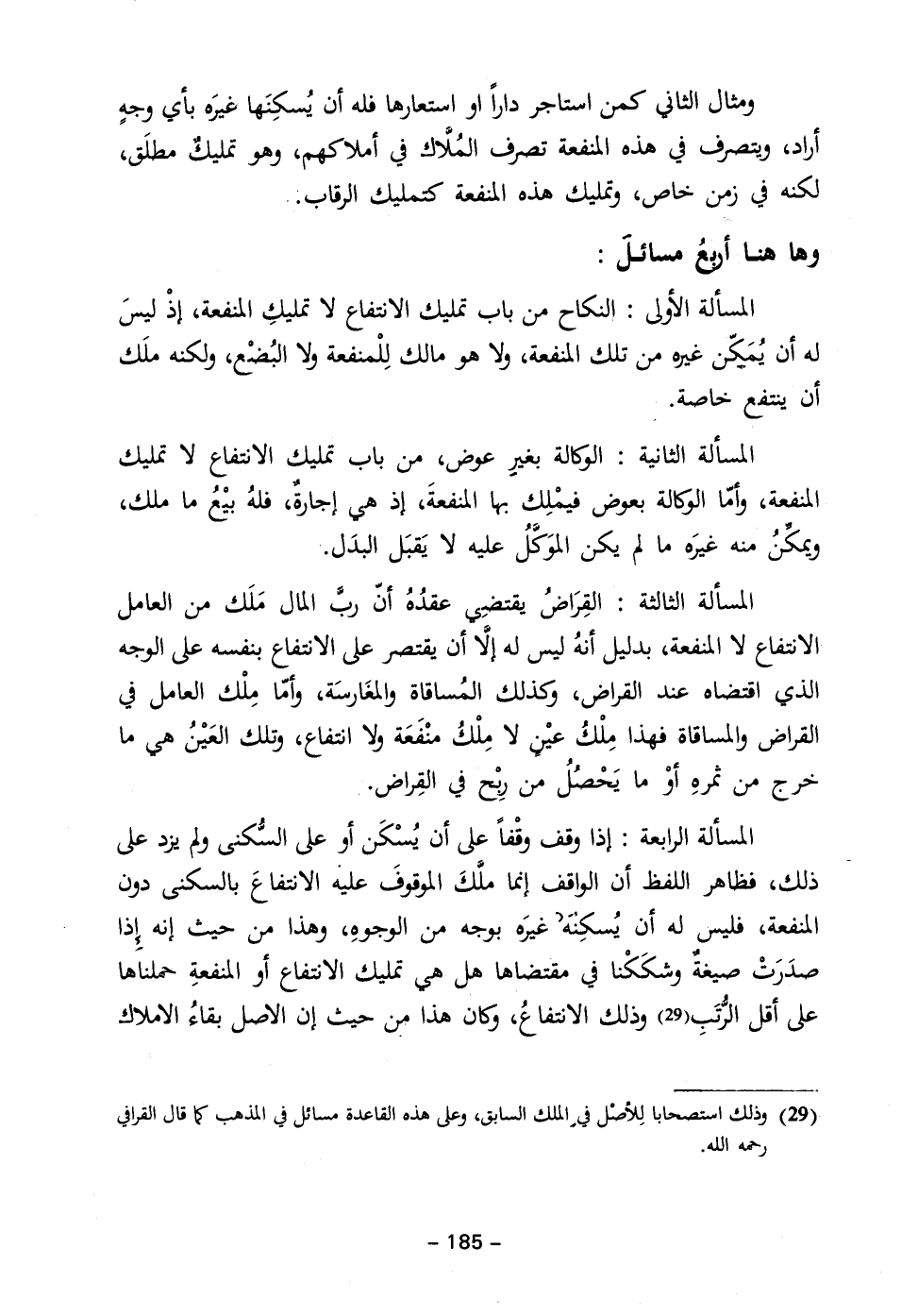(٢٩) وذلك استصحابا لِلأصْل في الملك السابق، وعلى هذه القاعدة مسائل في المذهب كما قال القرافي رحمه الله.