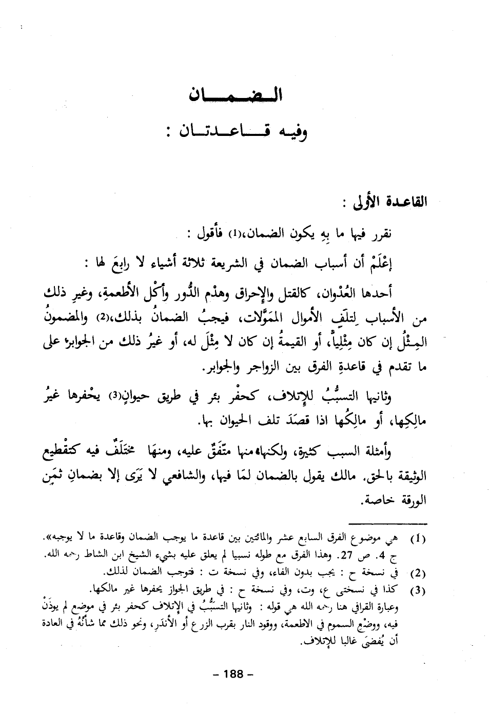 (١) هي موضوع الفرق السابع عشر والمائتين بين قاعدة ما يوجب الضمان وقاعدة ما لا يوجبه". جـ ٤. ص ٢٧. وهذا الفرق مع طوله نسبيا لم يعلق عليه بشيء الشيخ ابن الشاط رحمه الله.