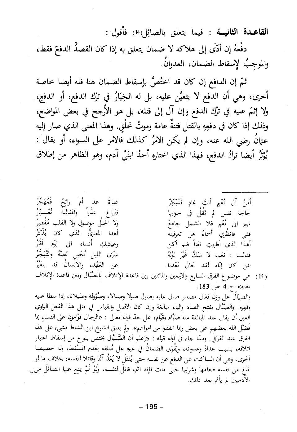 (١٤) هي موضوع الفرق السابع والاربعين والمائتين بين قاعدة الإتلاف بالصِّيَال وبرين قاعدة الإتلاف بغيره" جـ ٤ ص.١٨٣.