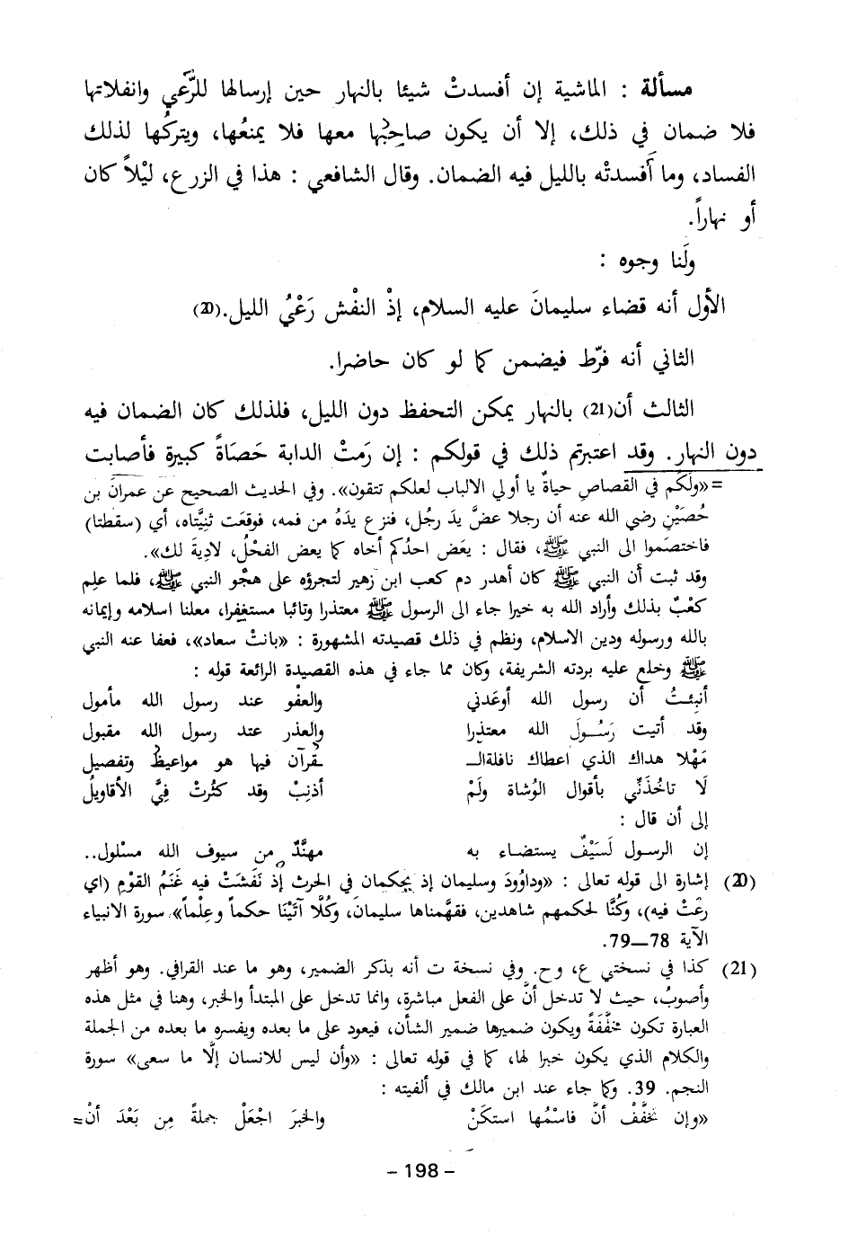 (٢٠) إشارة إلى قوله تعالى: {وَدَاوُودَ وَسُلَيْمَانَ إِذْ يَحْكُمَانِ فِي الْحَرْثِ إِذْ نَفَشَتْ فِيهِ غَنَمُ الْقَوْمِ (اي رعتْ فيه)، وَكُنَّا لِحُكْمِهِمْ شَاهِدِينَ (٧٨) فَفَهَّمْنَاهَا سُلَيْمَانَ وَكُلًّا آتَيْنَا حُكْمًا وَعِلْمًا} سورة الانبياء الآية ٧٨ - ٧٩.