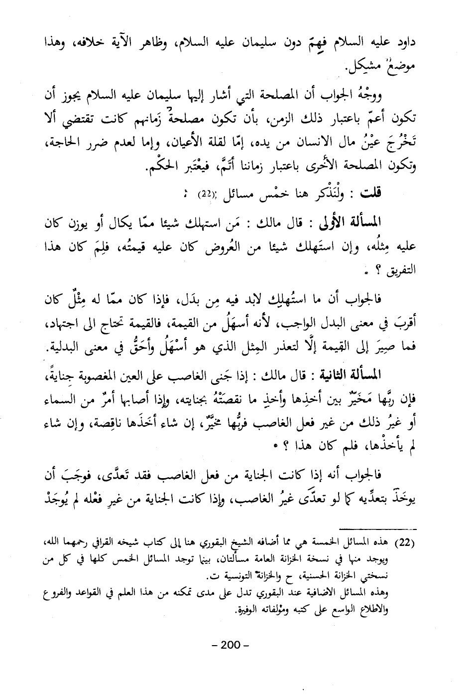 (٢٢) هذه المسائل الخمسة هي مما أضافه الشيخ البقوري هنا إلى كتاب شيخه القرافي رحمهما الله، ويوجد منها في نسخة الخزانة العامة مسألتان، بينما توجد المسائل الخمس كلها في كل من نسختى الخزانة الحسنية، ح والخزانه التونسية ت.