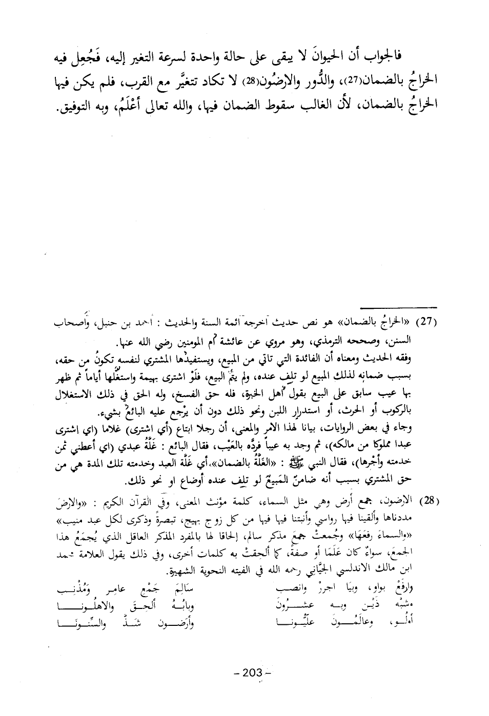 (٢٧) "الخراجُ بالضمان" هو نص حديث أخرجه ائمة السنة والحديث: احمد بن حنبل، واَصحاب السنن، وصححه الترمذي، وهو مروي عن عائشة أم المؤمنين رضي الله عنها.