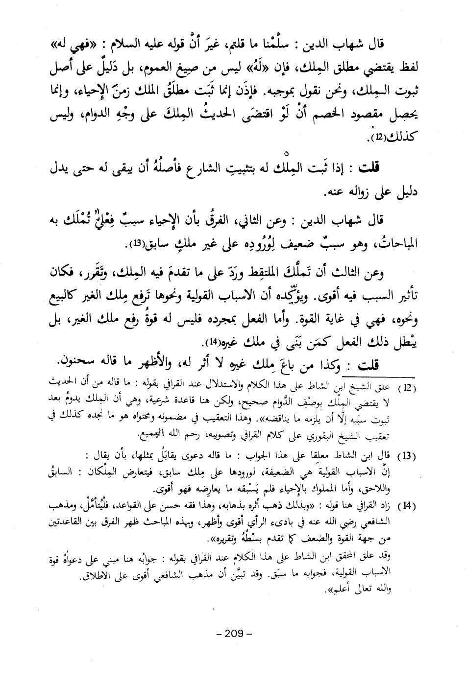 (١٢) علق الشيخ ابن الشاط على هذا الكلام والاستدلال عند القرافي بقوله: ما قاله من أن الحديث لا يقتضي المِلك بِوصْفِ الدَّوام صحيح، ولكن هنا قاعدة شرعية، وهَي أن المِلك يدومُ بعد ثبوت سبَبه إلَا أن يلزمه ما يناقضه". وهذا التعقيب في مضمونه ومحتواه هو ما نجده كذلك في تعقيب الشيخ البقوري على كلام القرافي وتصويبه، رحم الله الجميع.