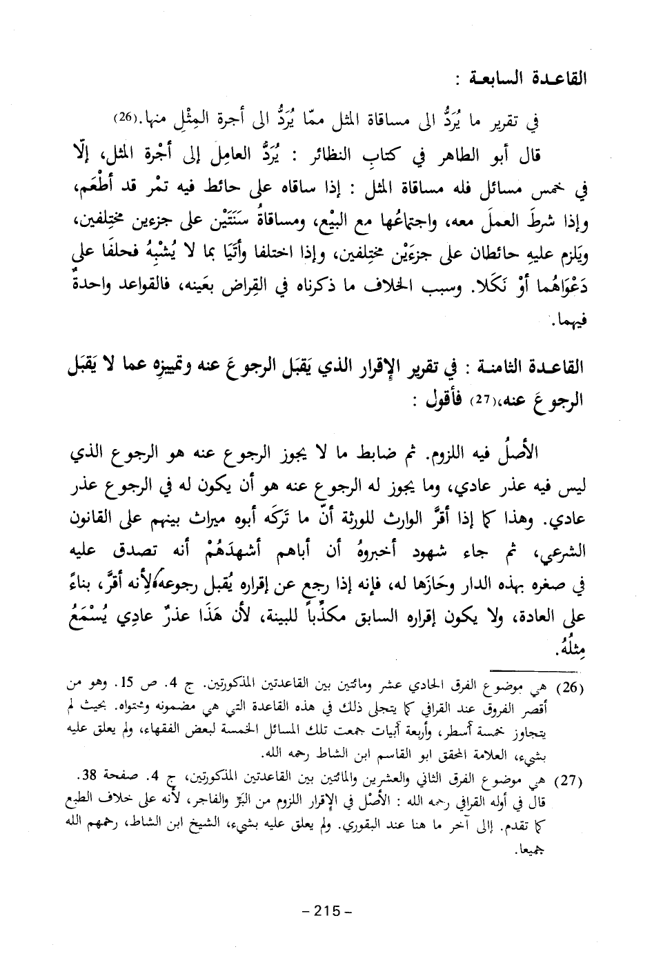 (٢٦) هي موضوع الفرق الحادي عشر ومائتين بين القاعدتين المذكورتين. جـ ٤. ص ١٥. وهو من أقصر الفروق عند القرافي كما يتجلى ذلك في هذه القاعدة التي هي مضمونه ومحتواه. بحيث لم يتجاوز خمسة أسطر، وأربعة أبيات جمعت تلك المسائل الخمسة لبعض الفقهاء، ولم يعلق عليه بشيء، العلامة المحقق ابو القاسم ابن الشاط رحمه الله.