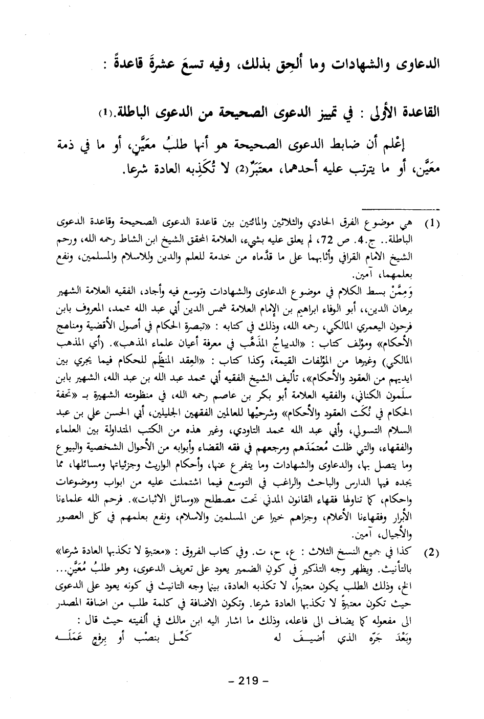 (١) هي موضوع الفرق الحادي والثلاثين والمائتين بين قاعدة الدعوى الصحيحة وقاعدة الدعوى الباطلة .. جـ ٤. ص ٧٢، لم يعلىق عليه بشيء، العلامة المحقق الشيخ ابن النشاط رحمه الله، ورحم الشيخ الامام القرافي وأثابهما على ما قدَّماه من خدمة للعلم والدين وللاسلام والمسلمين، ونفع بعلمهما، آمين.