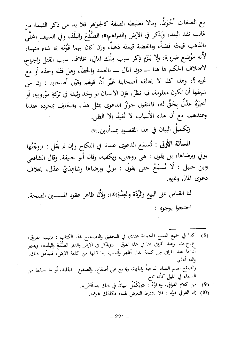(٩) من كلام القرافي، وعبارتُهُ: "ويَكْمُلُ البيانُ في ذلك بمسألتَيْن".