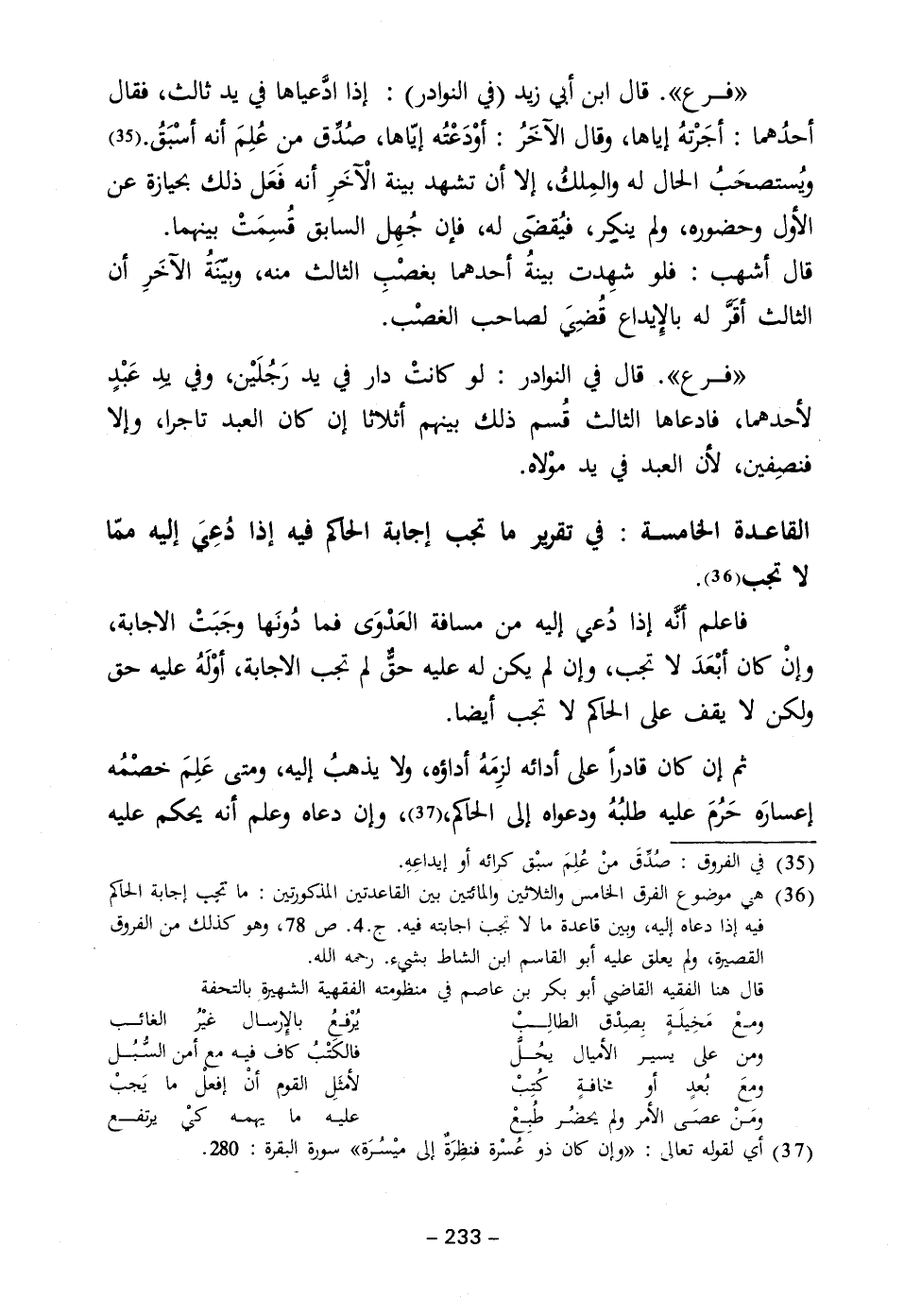 (٣٦) هي موضوع الفرق الخامس والثلاثين والمائتين بين القاعدتين المذكورتين: ما تجب إجابة الحاكم فيه إذا دعاه إليه، وبين قاعدة ما لا تجب اجابته فيه. جـ ٤. ص ٧٨، وهو كذلك من الفروق القصيرة، ولم يعلق عليه أبو القاسم ابن الشاط بشيء. رحمه الله.