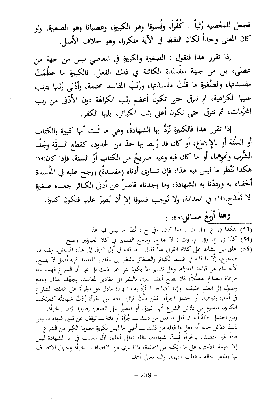 إذا تقرر هذا فنقول: الصغيرة والكبيرة في المعاصي ليس من جهة من عصَى، بل من جهة المفْسَدة الكائنة في ذلك الفعل. فالكبيرة ما عظُمَتْ مفسدتها، والصَّغيرة ما قلّتْ مَفْسدَتها، ورُتَبُ المفاسد مختلفة، وأدنى رُتبها يترتب عليها الكراهية، ثم تترقى حتى تكونَ أعظم رَتب الكراهَة دون الأدْنى من رتب المحرَّمات، ثم تترقى حتى تكون أعلى رتَب الكبائر، يليها الكفر.