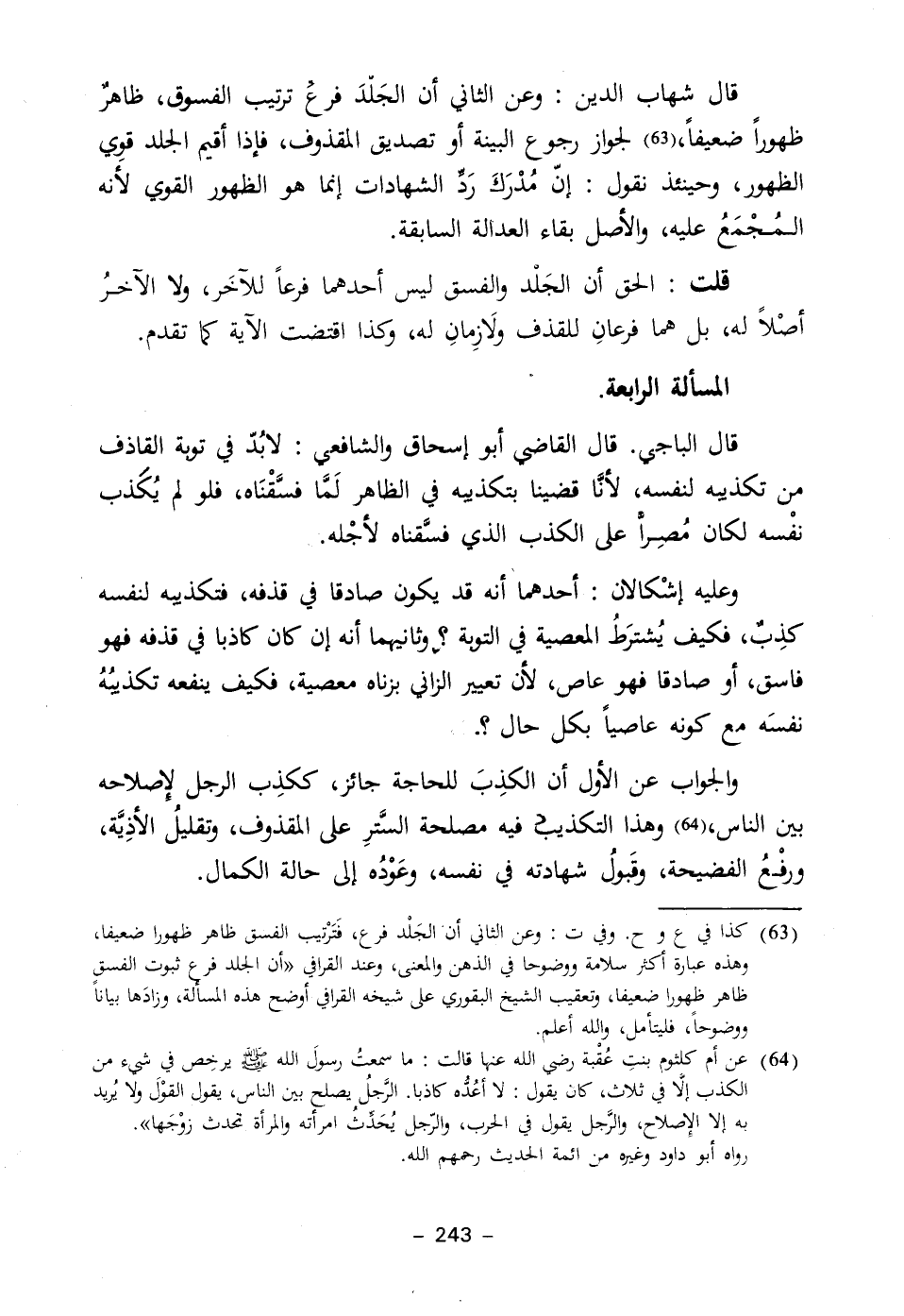 قال شهاب الدين: وعن الثاني أن الجَلدَ فرع ترتيب الفسوق، ظاهرٌ ظهوراً ضعيفاً، (٦٣) لجواز رجوع البينة أو تصديق المقذوف، فإذا أقيم الجلد قوِي الظهور، وحينئذ نقول: إنّ مُدْرَكَ رَدِّ الشهادات إنما هو الظهور القوي لأنه المُجْمَعُ عليه، والأصل بقاء العدالة السابقة.