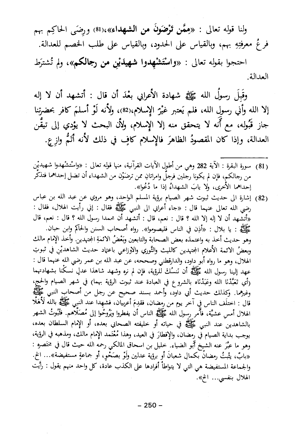(٨٢) إشارة إلى حديث ثبوت شهر الصيام برؤية المسلم الواحد، وهو مروي عن عبد الله بن عباس رضي الله تعالى عنهما قال: "جاء أعرابي إلى النبي - صلى الله عليه وسلم - فقال: إني رأيت الهلال، فقال: "أتشهد أن لا إله إلا الله؟ قال: نعم، قال: أتشهد أن محمدا رسول الله؟ قال: نعم، قال - صلى الله عليه وسلم -: يا بلال: "أذِن في الناس فليصوموا". رواه أصحاب السنن والحاكم وابن حبان.