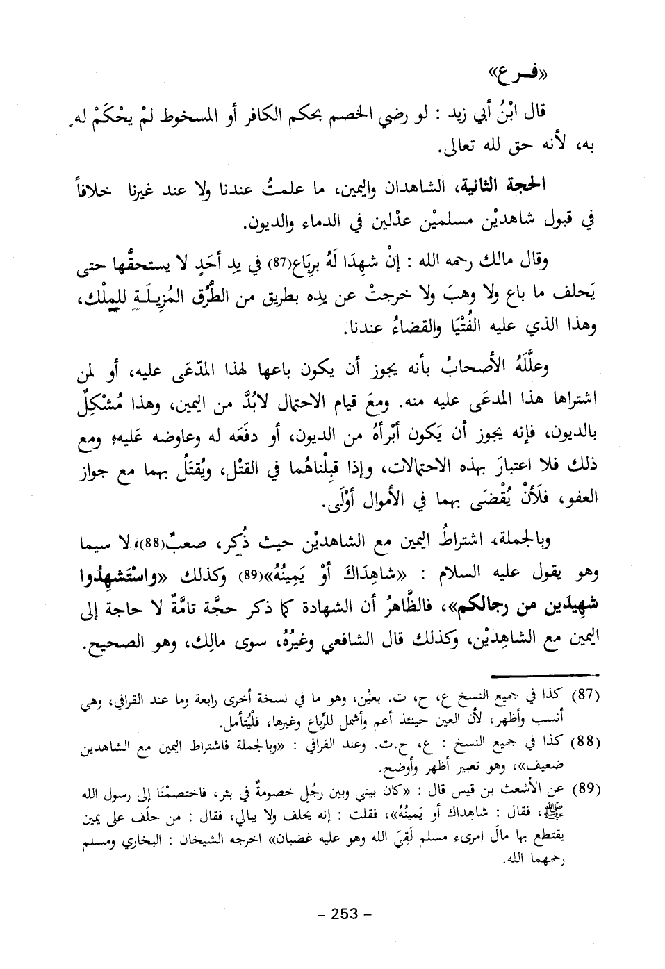 (٨٨) كذا في جميع النسخ: ع، ح. ت. وعند القرافي: "وبالجملة فاشتراط اليمين مع الشاهدين ضعيف"، وهو تعبير أظهر وأوضح.