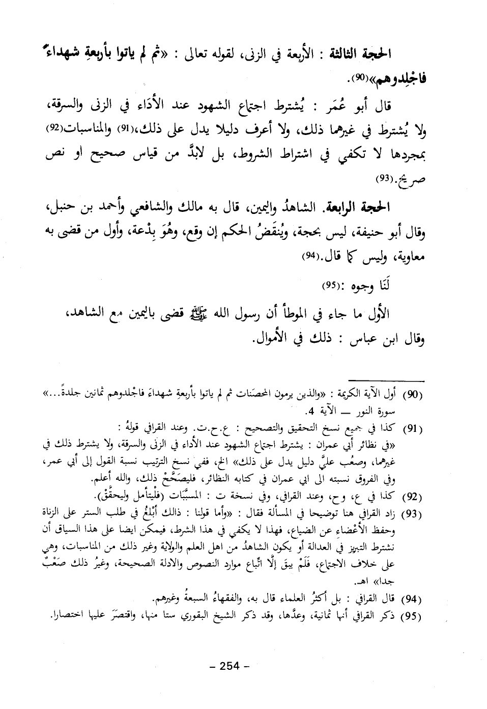 (٩٣) زاد القراقي هنا توضيحا في المسألة فقال: "وأما قولنا: ذالك أبْلغُ في طلب الستر على الزناة وحفظ الأعْضاءِ عن الضياع، فهذا لا يكفي في هذا الشرط، فيمكن ايضا على هذا السياق أن نشترط التبريز في العدالة أو يكون الشاهدُ من اهل العلم والولاية وغير ذلك من المناسبات، وهي على خلاف الاجتماع، فَلَمْ يبقَ إلا اتِّباع موارد النصوص والادلة الصحيحة، وغيرُ ذلك صَعْبٌ جدا" اهـ.