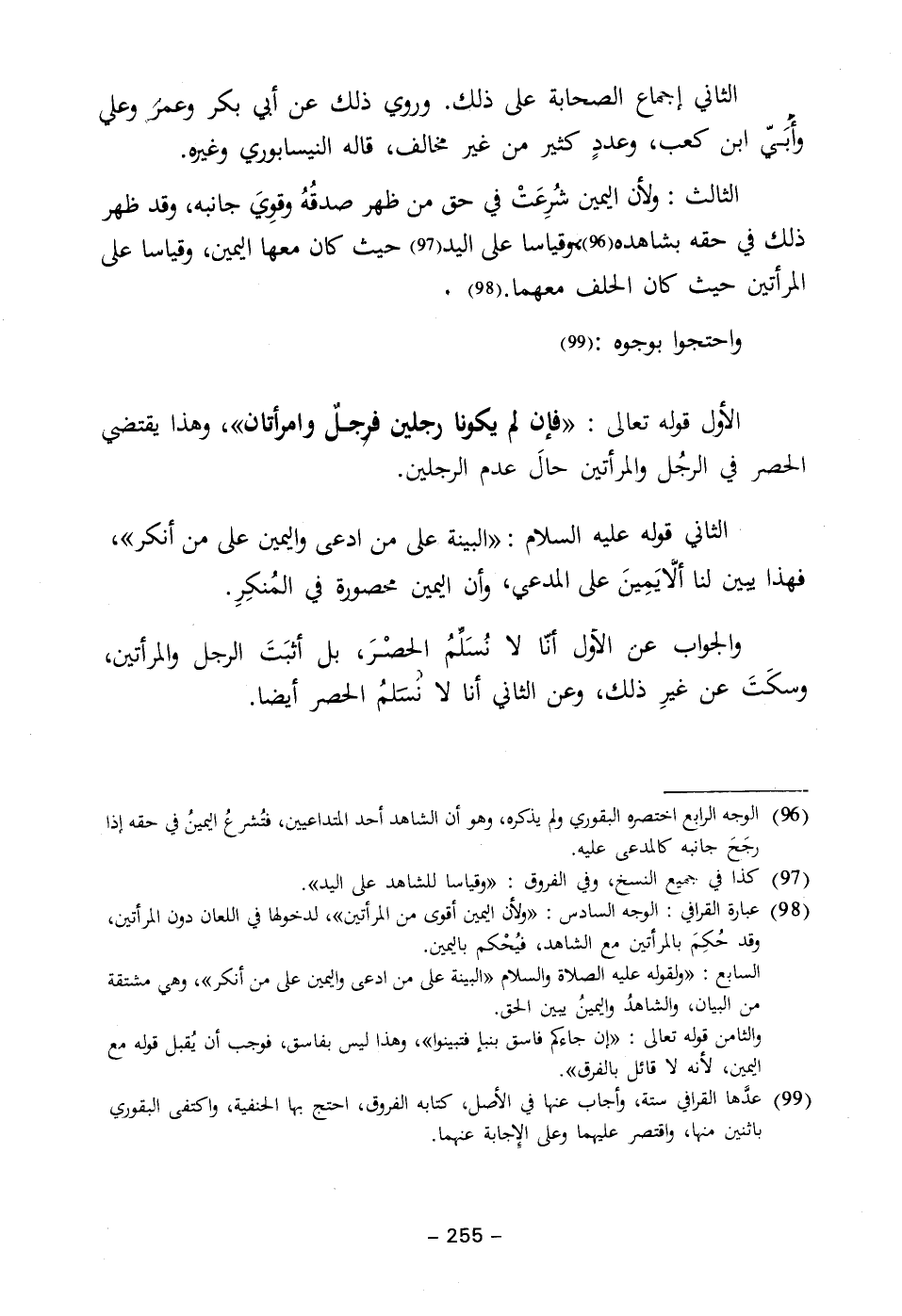 (٩٨) عبارة القرافي: الوجه السادس: "ولأن اليمين أقوى من المرأتين"، لدخولها في اللعان دون المرأتين، وقد حُكِمَ بالمرأتين مع الشاهد، فيُحْكم باليمين.