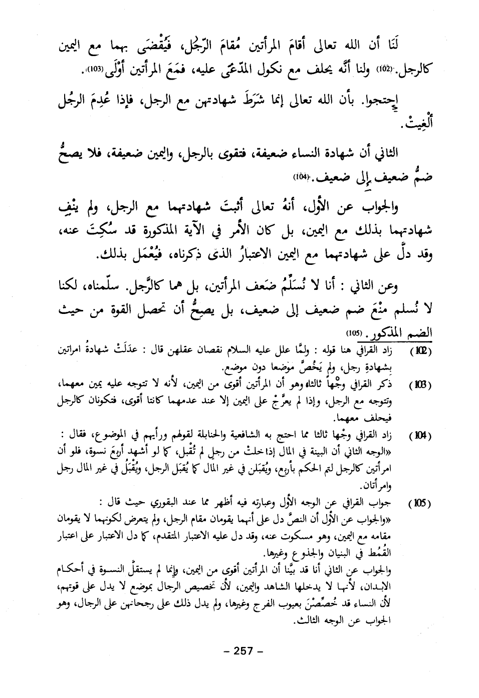(١٠٢) زاد القرافي هنا قوله: ولمَّا علل عليه السلام نقصان عقلهن قال: عدَلَتْ شهادةُ امراتين بشهادةِ رجل، ولم يَخُصَّ موضعا دون موضع.