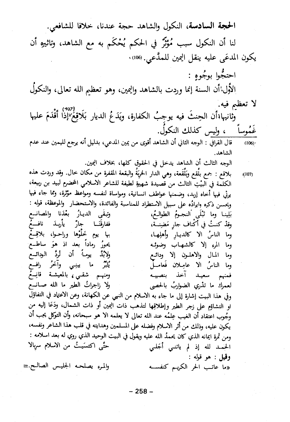 (١٠٦) قال القرافي: الوجه الثاني أن الشاهد أقوى من يمين المدعي، بدليل أنه يرجع لليمين عند عدم الشاهد.