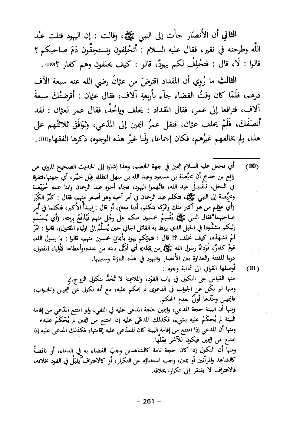 (١١٠) أي فجعل عليه السلام اليمين في جهة الخصم، وهذا إشارة إلى الحديث الصحيح المروى عن رافع بن خديج أن محيِّصَة بن مسعود وعبد الله بن سهل انطلقا قِبَل خيْبَر، أي جهتها، فتفرقا في النخل، فقُتِلَ عبد الله، فاتَّهموا اليهود، فجاء أخوه عبد الرحمان وابنا عمه حُوَيّصة ومحيِّصة إلى النبي - صلى الله عليه وسلم -، فتكلم عبد الرحمان في أمر أخيه وهو أصغر منهم، فقال: كبِّرْ الكُبْر (أي عظم من هو أكبر منك واتْركه يتكلم، أدبا معه)، أو قال: لِيبدأْ الأكبر، فتكلما في أمر صاحبهما فقال النبي - صلى الله عليه وسلم - يُقْسِمُ خمسون منكم على رجُل منهم فَيُدْفَعُ بِرمته، (أي يُسَلَّم إليكم مشدودا في الحبل الذي يربط به القاتل الجاني حين يُسلَّمُ إلى اولياء المقتول)، قالوا: أمْرٌ لمْ نَشهَدْه، كيف نحلف؟ ! قال: فتبرئكم يهود بأيمان خمسين منهم، قالوا: يا رسول الله، قومٌ كفارٌ، فَوَداهُ رسول الله - صلى الله عليه وسلم - مِن قِبَله" أي أدَّى ديته من عنده، وأعطاها لأولياء المقتول، درءا للفتنة والعداوة بين الأنصار واليهود في هذه النازلة وسببها.