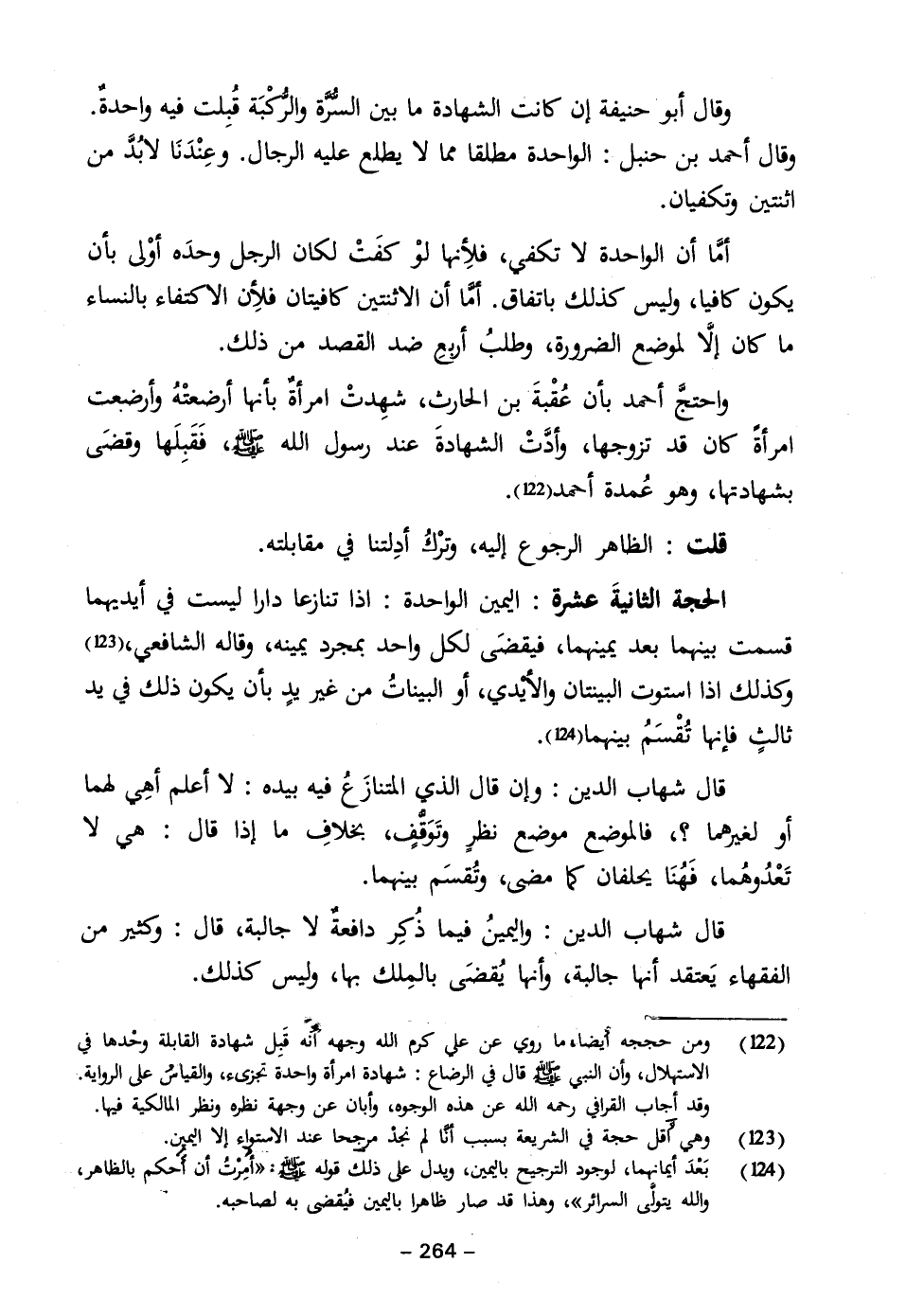 واحتجَّ أحمد بأن عُقْبةَ بن الحارث، شهِدتْ امرأةٌ بأنها أرضعتْهُ وأرضعت امرأةً كان قد تزوجها، وأدَّتْ الشهادةَ عند رسول الله - صلى الله عليه وسلم -، فَقَبِلَها وقضَى بشهادتها، وهو عُمدة أحمد (١٢٢).