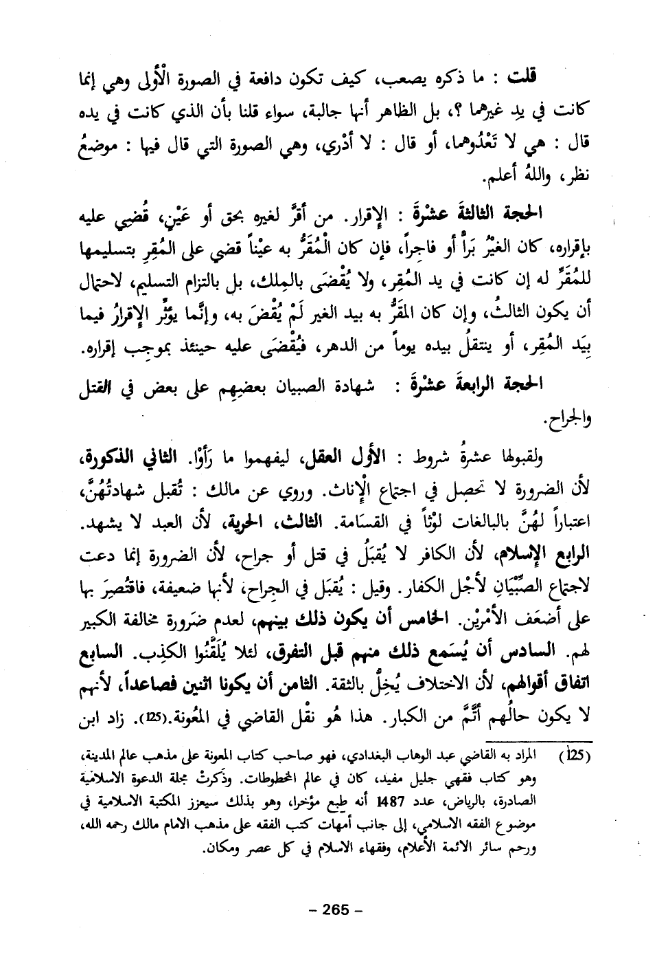 ولقبولها عشرةُ شروط: الأول العقل، ليفهموا ما رَأوْا. الثاني الذكورة، لأن الضرورة لا تحضل في اجتماع الْإِناث. وروي عن مالك: تُقبل شهادتُهُنَّ، اعتباراً لهُنَّ بالبالغات لوْثاً في القسَامة. الثالث، الحرية، لأن العبد لا يشهد. الرابع الإِسلام، لأن الكافر لا يُقبَلُ في قتل أو جراح، لأن الضرورة إنما دعت لاجتماع الصِّبْيَانِ لأجْل الكفار. وقيل: يُقبَل في الجِراح، لأنها ضعيفة، فاقتُصِرَ بها على أضعَف الأمْريْن. الخامس أن يكون ذلك بينهم، لعدم ضَرورة مخالفة الكبير لهم. السادس أن يُسَمع ذلك فهم قبل التفرق، لئلا يُلَقَّنُوا الكذِب. السابع اتفاق أقوالهم، لأن الاختلاف يُخِلُّ بالثقة. الثامن أن يكونا اثنين فصاعداً، لأنهم لا يكون حالُهم أتَّمَّ من الكبار. هذا هُو نقْل القاضي في المعُونة. (١٢٥). زاد ابن