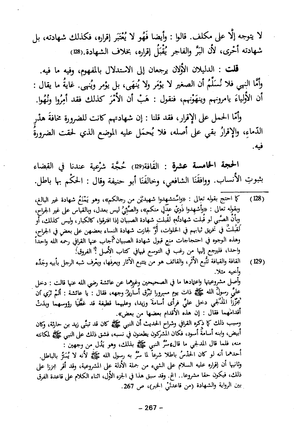 الحجة الخامسة عشرة: القَافة (١٢٩) حُجَّة شرْعية عندنا في القضاء بثبوتِ الأنساب. ووافقَنَا الشافعي، وخالفَنَا أبو حنيفة وقال: الحكْم بها باطل.