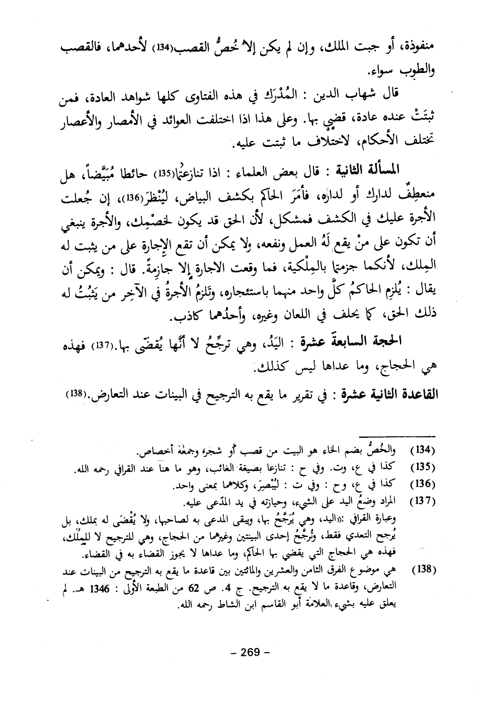 (١٣٨) هي موضوع الفرق الثامن والعشرين والمائتين بين قاعدة ما يقع به الترجيح من البينات عند التعارض، وقاعدة ما لا يقع به الترجيح. جـ ٤. ص ٦٢ من الطبعة الأولى: ١٣٤٦ هـ. لم يعلق عليه بشيء، العلامة أبو القاسم ابن الشاط رحمه الله.