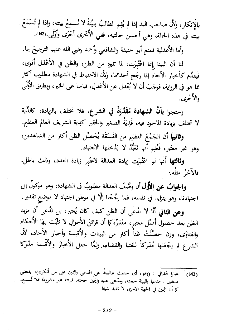 (١٤٢) عبارة القرافي: (وهو، أي حديث "البينةُ على المدعي واليمين على من أنكر")، يقتضي صنفين: مدعيا والبينة حجته، ومدّعى عليه واليمين حجته. فبينته غير مشروعة فلا تُسمع، كما أن اليمين في الجهة الاخرى لا تفيد شيئا.