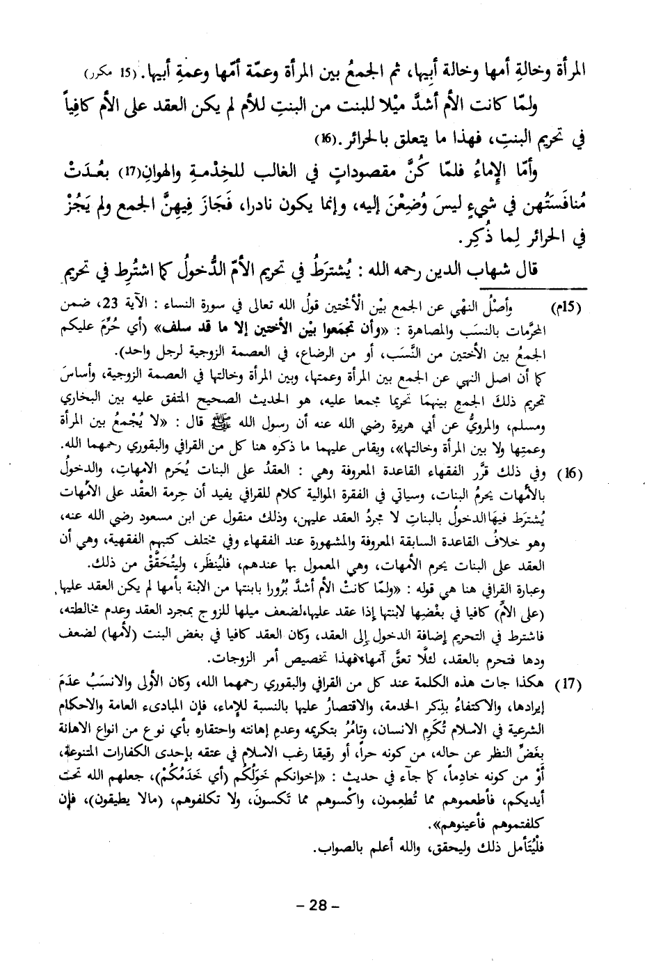 كما أن أصل النهي عن الجمع بين المرأة وعمتها، وبين المرأة وخالتها في العصمة الزوجية، وأساسَ تحريم ذلكَ الجمعِ بينهمَا تحريما مجمعا عليه، هو الحديث الصحيح المتفق عليه بين البخاري ومسلم، والمرويُّ عن أبي هريرة رضي الله عنه أن رسول الله - صلى الله عليه وسلم -قال: "لا يُجْمعُ بين المرأة وعمتِها ولا بين المرأة وخالتها"، ويقاس عليهما ما ذكره هنا كل من القرافي والبقوري رحمهما الله. (١٦) وفي ذلك قرَّر الفقهاء القاعدة المعروفة وهي: العقدُ على البنات يُحَرم الامهاتِ، والدخولُ بالأمّهات يحرمُ البنات، وسياتي في الفقرة الموالية كلام للقرافي يفيد أن حِرمة العقْد على الأمهات يُشترَط فيهَا الدخولُ بالبناتِ لا مجردُ العقد عليهن، وذلك منقول عن ابن مسعود رضي الله عنه، وهو خلافُ القاعدة السابقة المعروفة والمشهورة عند الفقهاء وفي: مختلف كتبهم الفقهية، وهي أن العقد على البنات يحرم الأمهات، وهي المعمول بها عندهم، فليُنظَر، وليتُحَقَّقْ من ذلك.