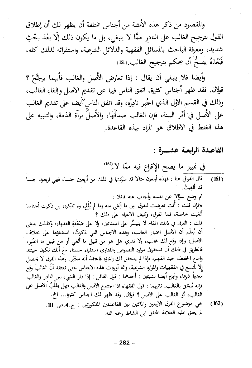 (١٦١) قال القرافي هنا: فهذه أربعون مثالا قد سَرَدتها في ذلك من أربعين جنسا، فهي اربعون جنسا قد ألغِيتْ.