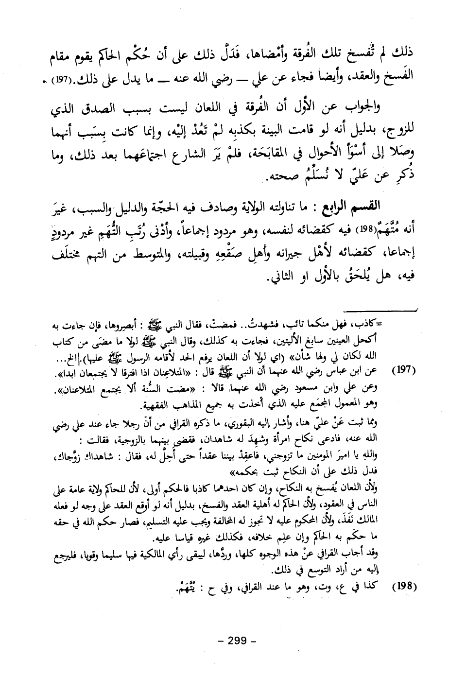 القسم الرابع: ما تناولته الولاية وصادف فيه الحجّة والدليلَ والسبب، غيرَ أنه مُتَّهَمٌ (١٩٨) فيه كفضائه لنفسه، وهو مردود إجماعاً، وأدْني رُتَبِ التُّهَمِ غير مردودٍ إجماعا، كقضائه لأهْل جيرانه وأهلِ صَقْعِهِ وقبيلته، والمتوسط من التهم مختلَف فيه، هل يُلحَقُ بالأول او الثاني.