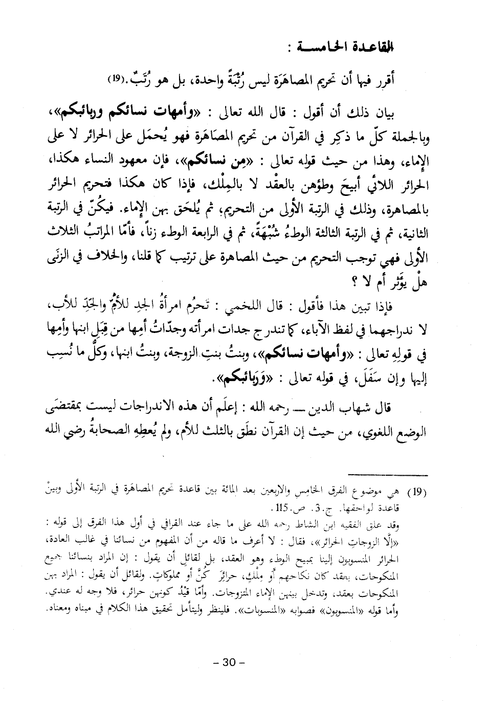 (١٩) هي موضوع الفرق الخامس والاربعين بعد المائة بين قاعدة تحريم المصاهَرة في الرتبة الأولى وبيْن قاعدة، لواحقها. جـ ٣. ص.١١٥.
