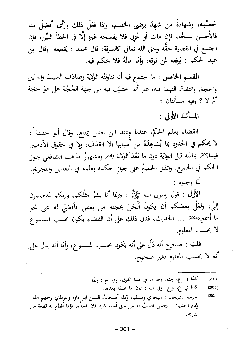 القسم الخامس: ما اجتمع فيه أنه تناولتْه الولاية وصادَف السببَ والدليل والحجة، وانتفتْ التهمة فيه، غير أنه اختلف فيه من جهة الحُجَّة هل هوَ حجة أمْ لا؟ وفيه مسألتان: