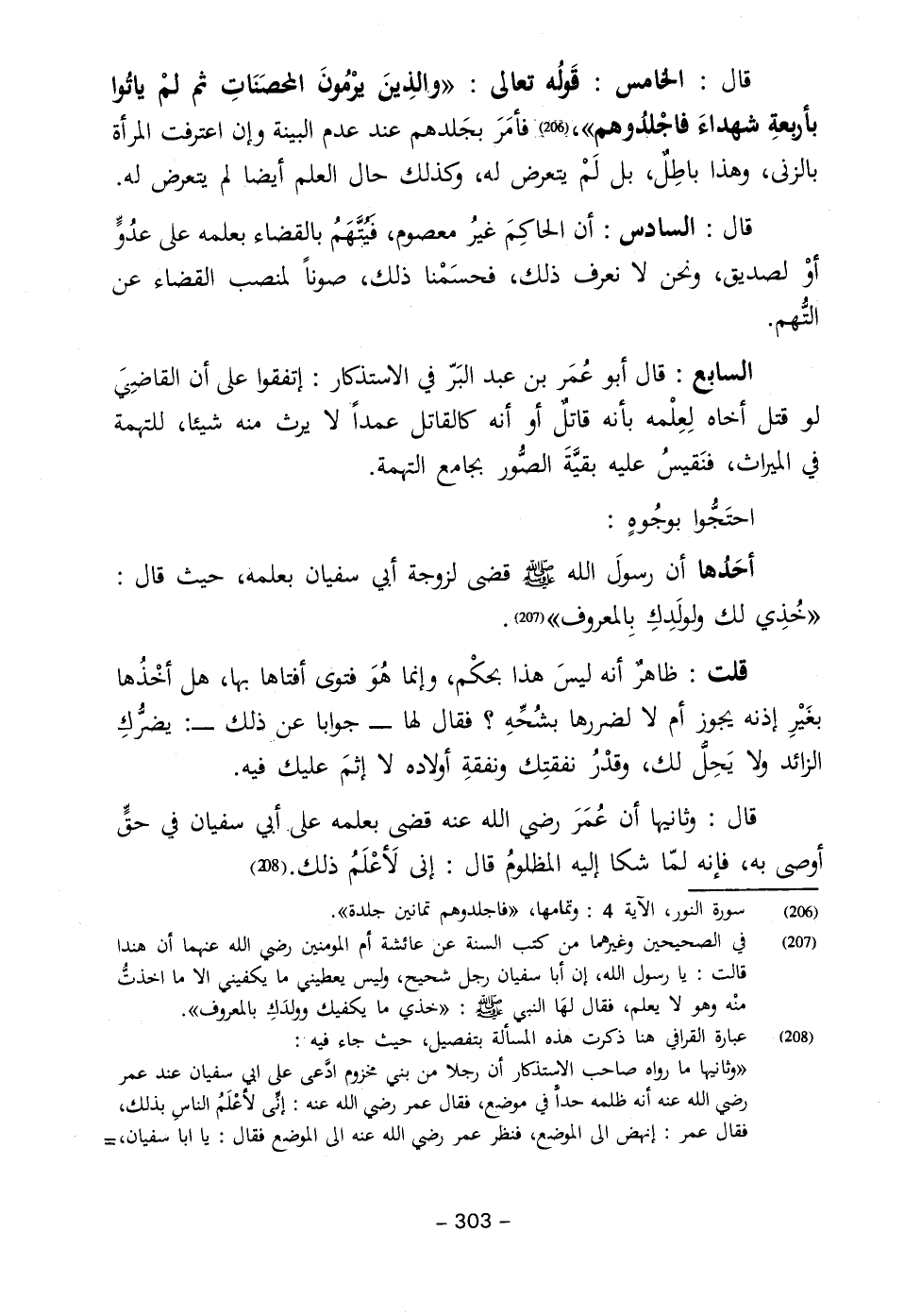 قال: وثانيها أن عُمَرَ رضي الله عنه قضى بعلمه على أبي سفيان في حقٍّ أوصى به، فإنه لمّا شكا إليه المظلومُ قال: إني لَأعْلَمُ ذلك. (٢٠٨)