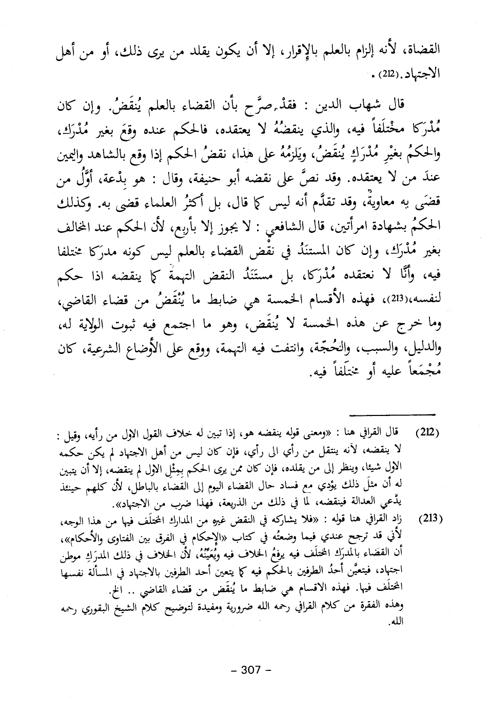 (٢١٣) زاد القرافي هنا قوله: "فلا يشاركه في النقض غيره من المدارك المختلَف فيها من هذا الوجه، لأني قد ترجح عندي فيما وضعتُه في كتاب "الإحكام في الفرق بين الفتاوى والأحكام"، أن القضاء بالمدرَك المختلَف فيه يرفع الخلاف فيه ويُعَيِّنُهُ، لأن الخلاف في ذلك المدرَكِ موطن اجتهاد، فيتعيَّن أحدُ الطرفين بالحكم فيه كما يتعين أحد الطرفين بالاجتهاد في المسألة نفسها المختلَف فيها. فهذه الاقسام هي ضابط ما يُنقَض من قضاء القاضي .. الخ.