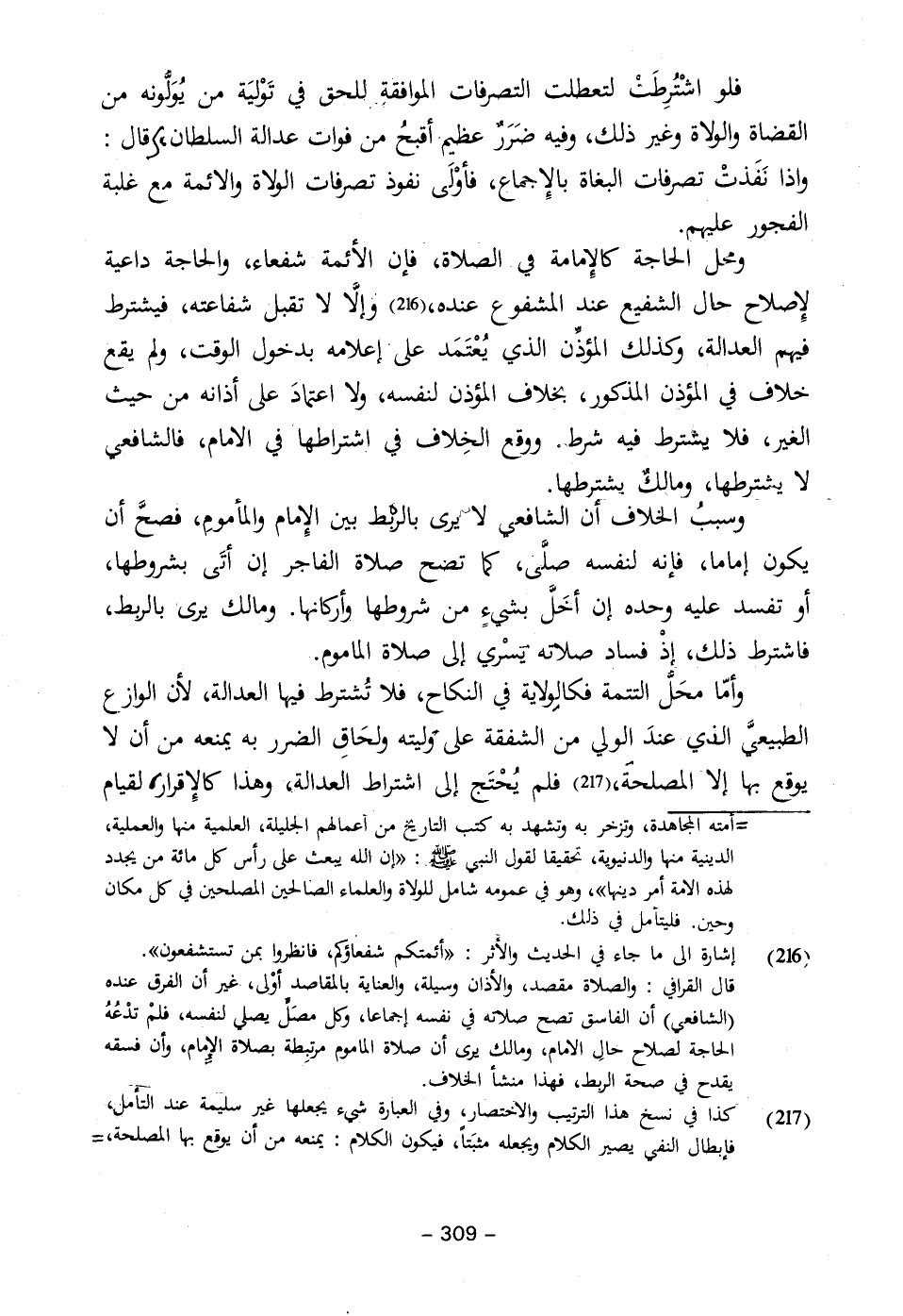ومحل الحاجة كالإِمامة في الصلاة، فإن الأئمة شفعاء، والحاجة داعية لِإصلاخ حال الشفبع عند المشفوع عنده، (٢١٦) وإلَّا لا تقبل شفاعته، فيشترط فيهم العدالة، وكذلك المؤذِّن الذي يُعْتَمَد على إعلامه بدخول الوقت، ولم يقع خلاف في المؤذن المذكور، بخلاف المؤذن لنفسه، ولا اعتمادَ على أذانه من حيث الغير، فلا يشترط فيه شرط. ووقع الخِلاف في اشتراطها في الامام، فالشافعي لا يشترطها، ومالكٌ يشترطها.