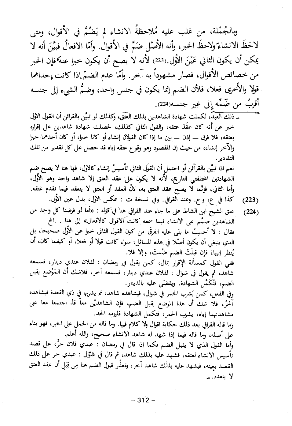 (٢٢٤) علق الشيخ ابن الشاط على ما جاء عند القرافيِ هنا قوله: "أما لو فرضنا كل واحد من الشاهدين صمَّم على الانشاء فيما سمعه كانتَ الاقوال كالافعال" إلى هنا ... الخ
