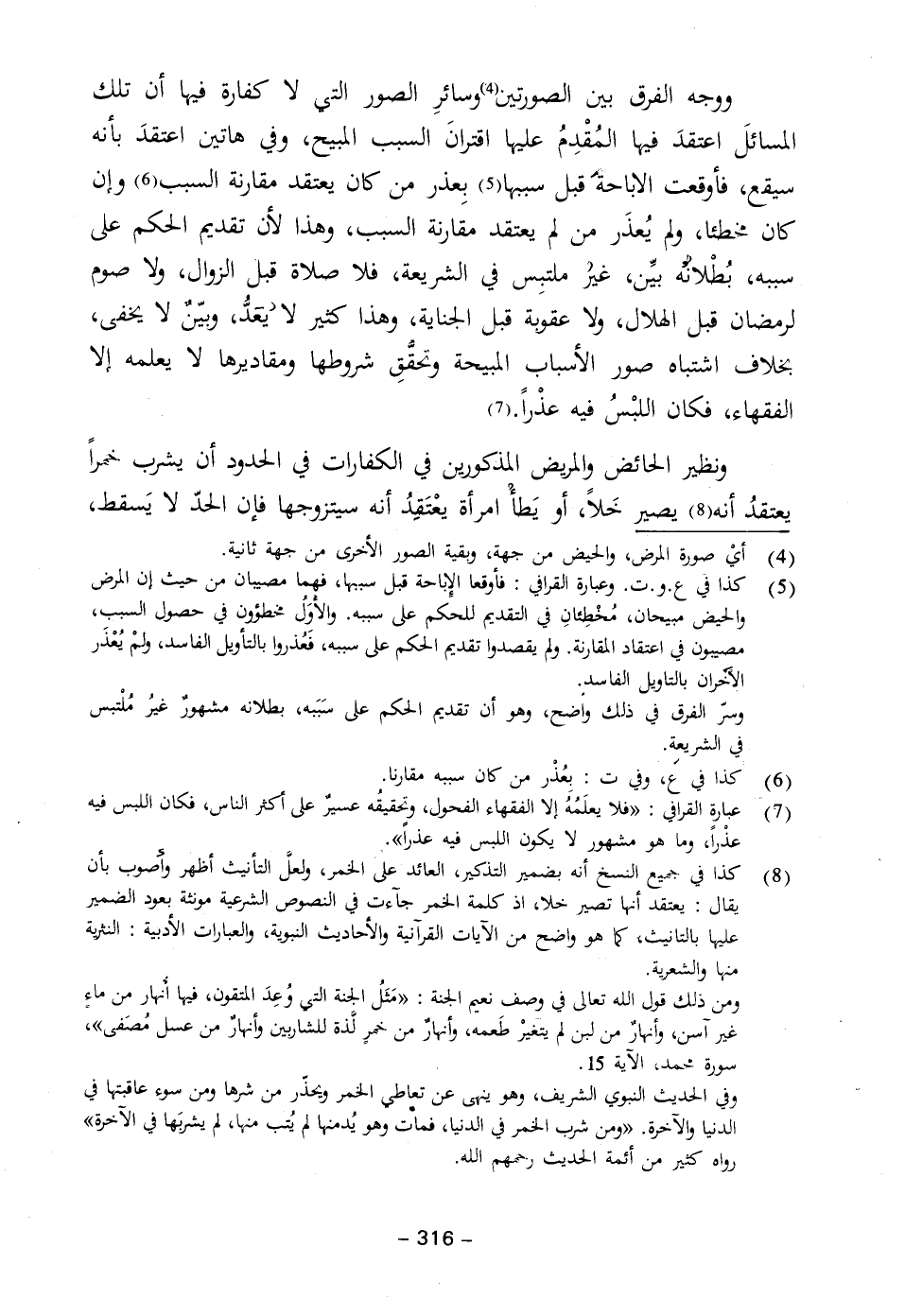(٧) عبارة القرافي: "فلا يعلَمُهُ إلا الفقهاء الفحول، وتحقيقُه عسيرٌ على أكثر الناس، فكان اللبس عذْرا، وما هو مشهور لا يكون اللبس عذراً".