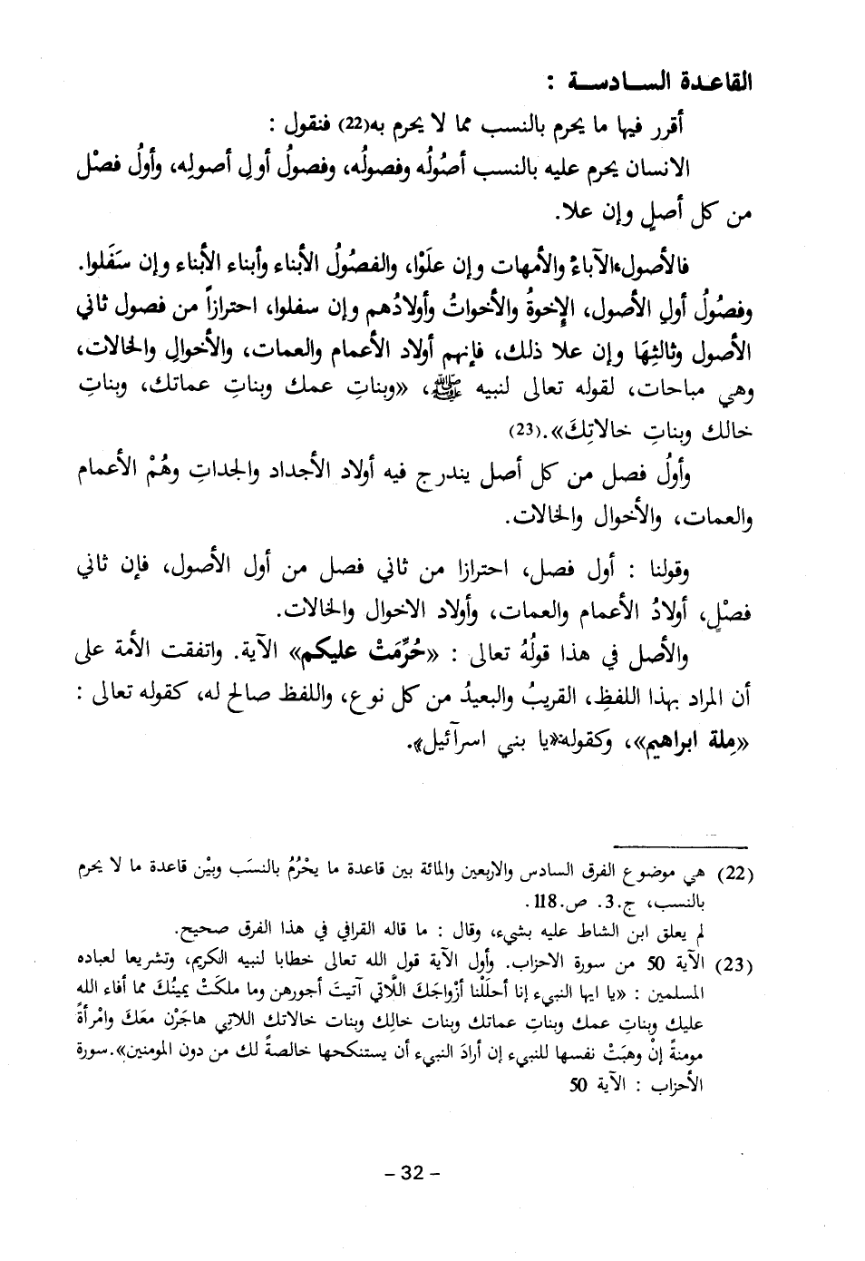 (٢٢) هي موضوع الفرق السادس والاربعين والمائة بين قاعدة ما يحْرُمُ بالنَسب وبيْن قاعدة ما لا يحرم بالنسب، جـ ٣. ص. ١١٨.