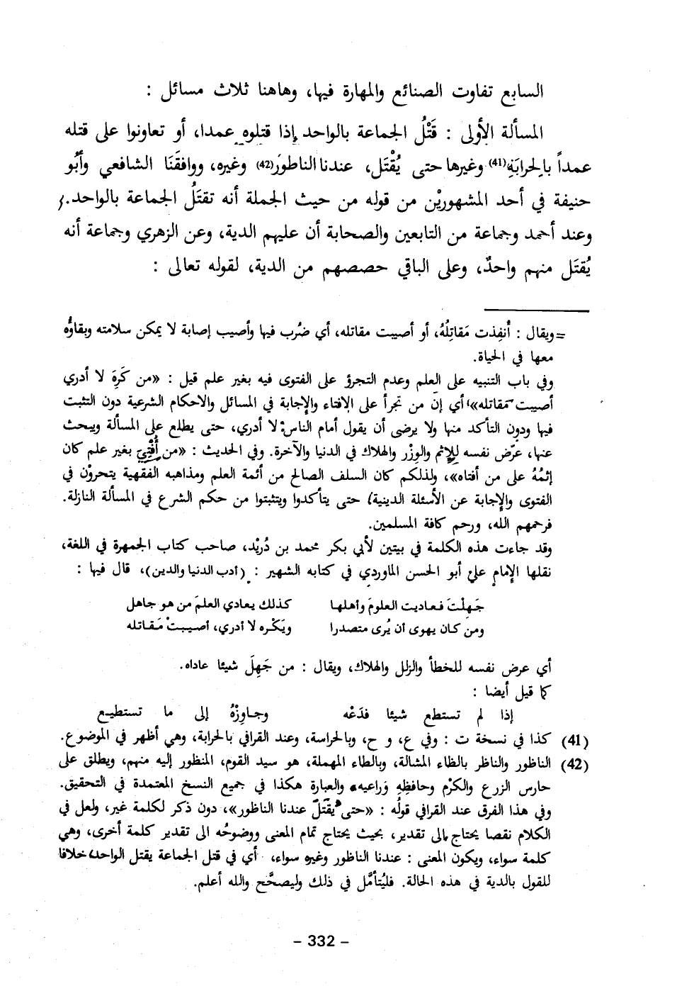 المسألة الأولى: قَتْلُ الجماعة بالواحد إذا قتلوه عمدا، أو تعاونوا على قتله عمداً بالِحرابَةِ (٤١). وغيرها حتى يُقْتَل، عندنا الناطوَر (٤٢) وغيره، ووافقَنَا الشافعي وأبُو حنيفة في أحد المشهورْين من قوله من حيث الجملة أنه تقتَلُ الجماعة بالواحد. وعند أحمد وجماعة من التابعين والصحابة أن عليهم الدية، وعن الزهري وجماعة أنه يُقتَل منهم واحدٌ، وعلى الباقي حصصهم من الدية، لقوله تعالى: