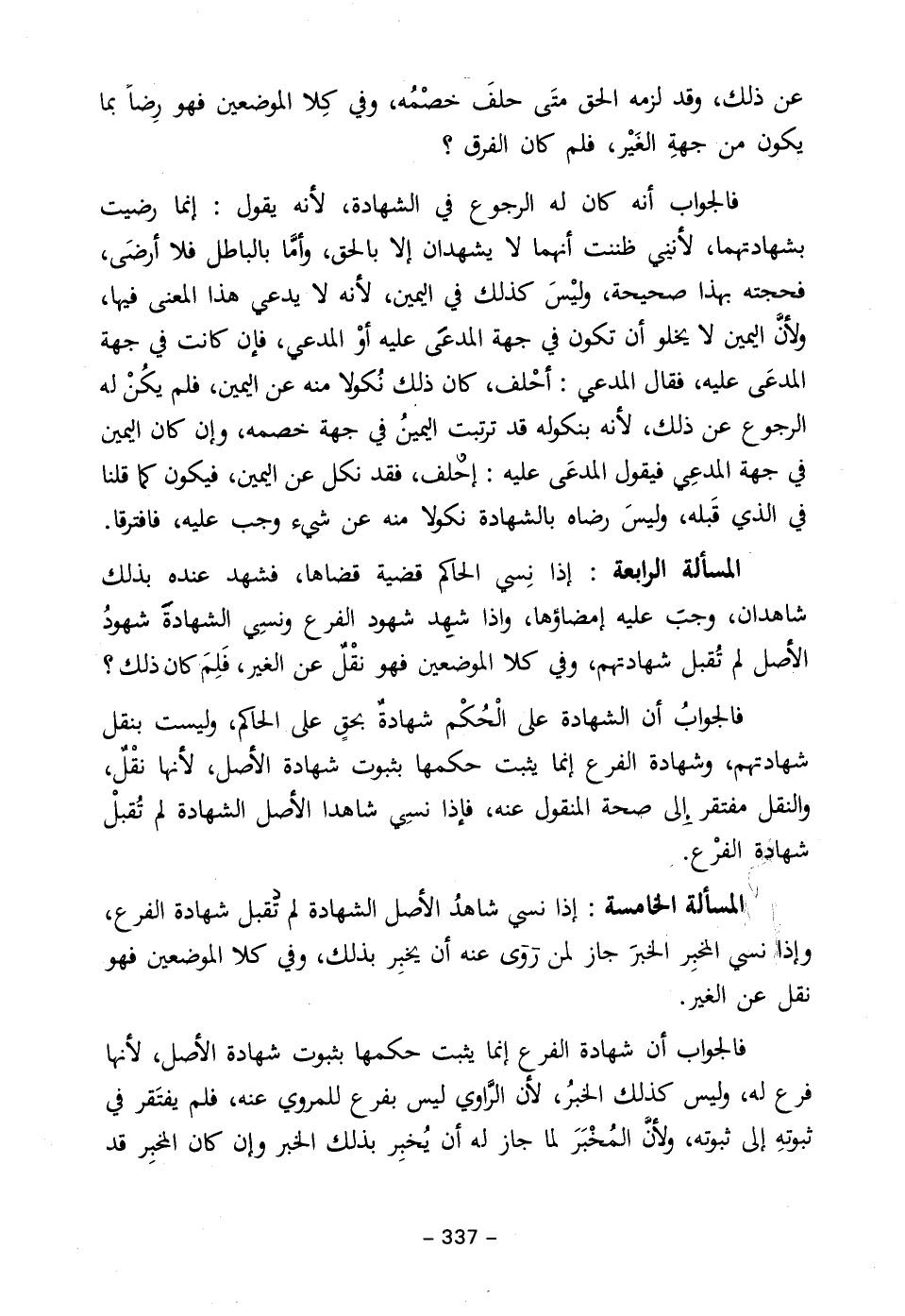 المسألة الرابعة: إذا نِسى الحاكم قضية قضاها، فشهد عنده بذلك شاهدان، وجبَ عليه إمضاؤها، واذا شهِد شهود الفرع ونسي الشهادةَ شهودُ الأصل لم تُقبل شهادتهم، وفي كلا الموضعين فهو نقْلٌ عن الغير، فَلِمَ كان ذلك؟